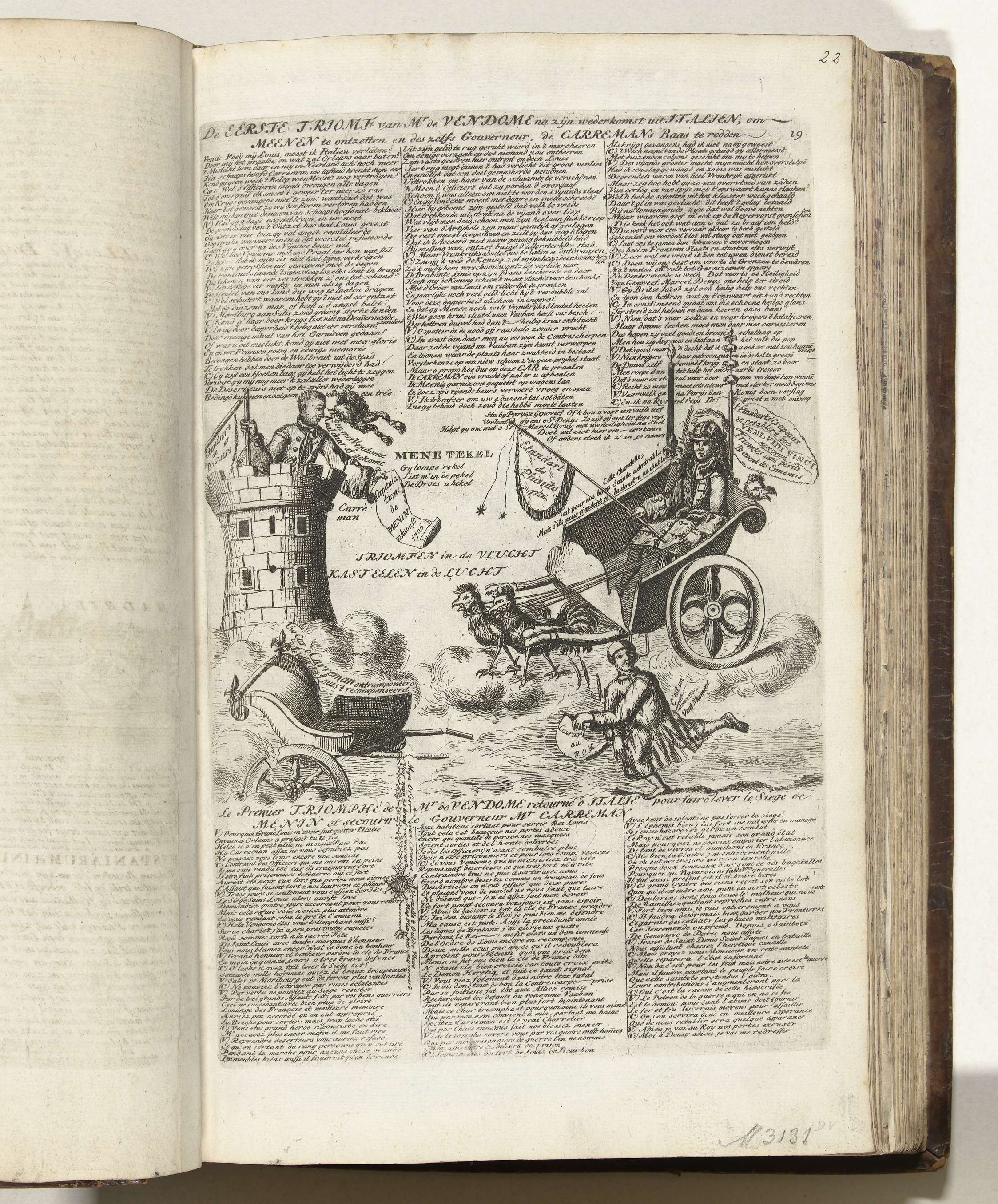 Spotprent op het verlies van Menen en de komst van de hertog van Vendôme vanuit Italië naar Brabant, 1706. Carremans, de bevelhebber te Menen, staande op een toren beklaagt de overgave van de stad op 22 augustus 1706. Vendôme in een strijdwagen getrokken door Franse hanen. In de plaat 3 kolommen verzen in het Nederlands ...