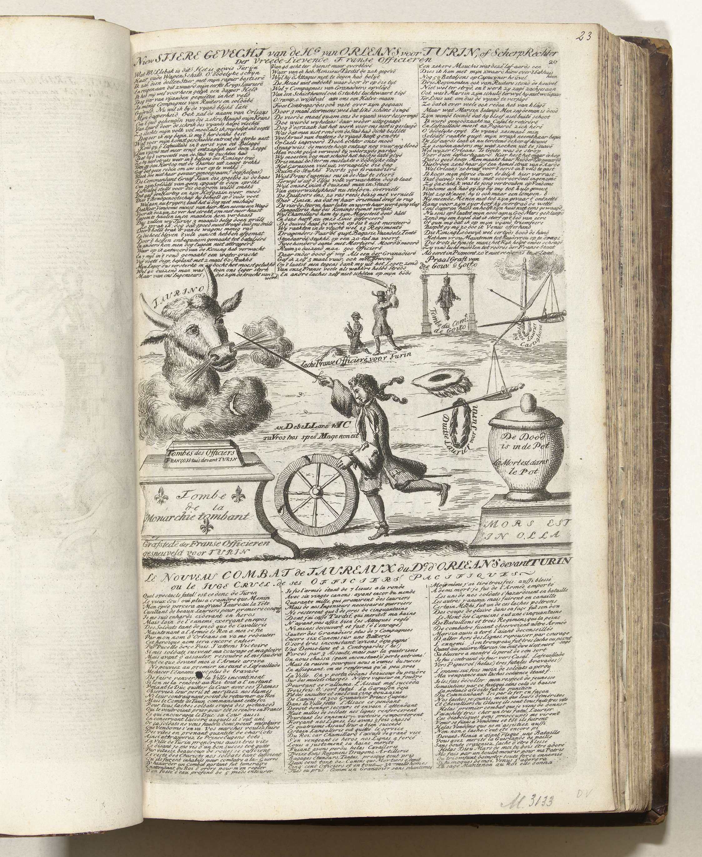 Spotprent op het mislukte Franse beleg van Turijn, ontzet door de geallieerden op 7 september 1706. De Franse bevelhebber Filips II, hertog van Orléans, speelt met een hoepel, links een briesende stierenkop. Op de achtergrond terechtstellingen van Franse officieren. In de plaat 3 kolommen verzen in het Nederlands en Frans. Blad nr. 20 (genummerd rechtsboven) ...