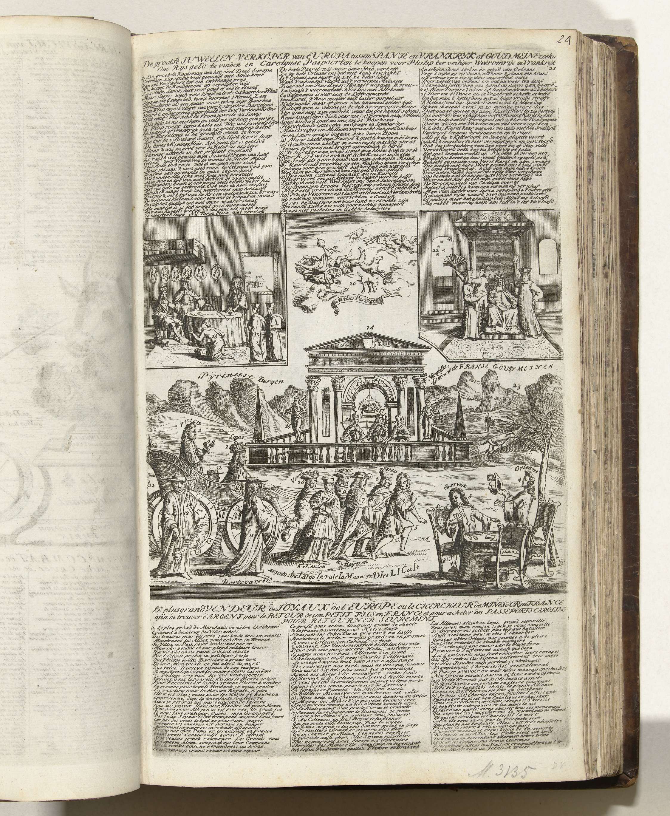 Triomfwagen met Lodewijk XIV en de hertog van Anjou door zes vorsten getrokken in de richting van een tempel waar de Spaanse kroon bewaard wordt. Bovenaan twee cartouches met voorstellingen met jezuïeten, 1706. In de plaat 3 kolommen verzen in het Nederlands en Frans. Blad nr. 21 (genummerd rechtsboven) in de serie van 25 bladen ...