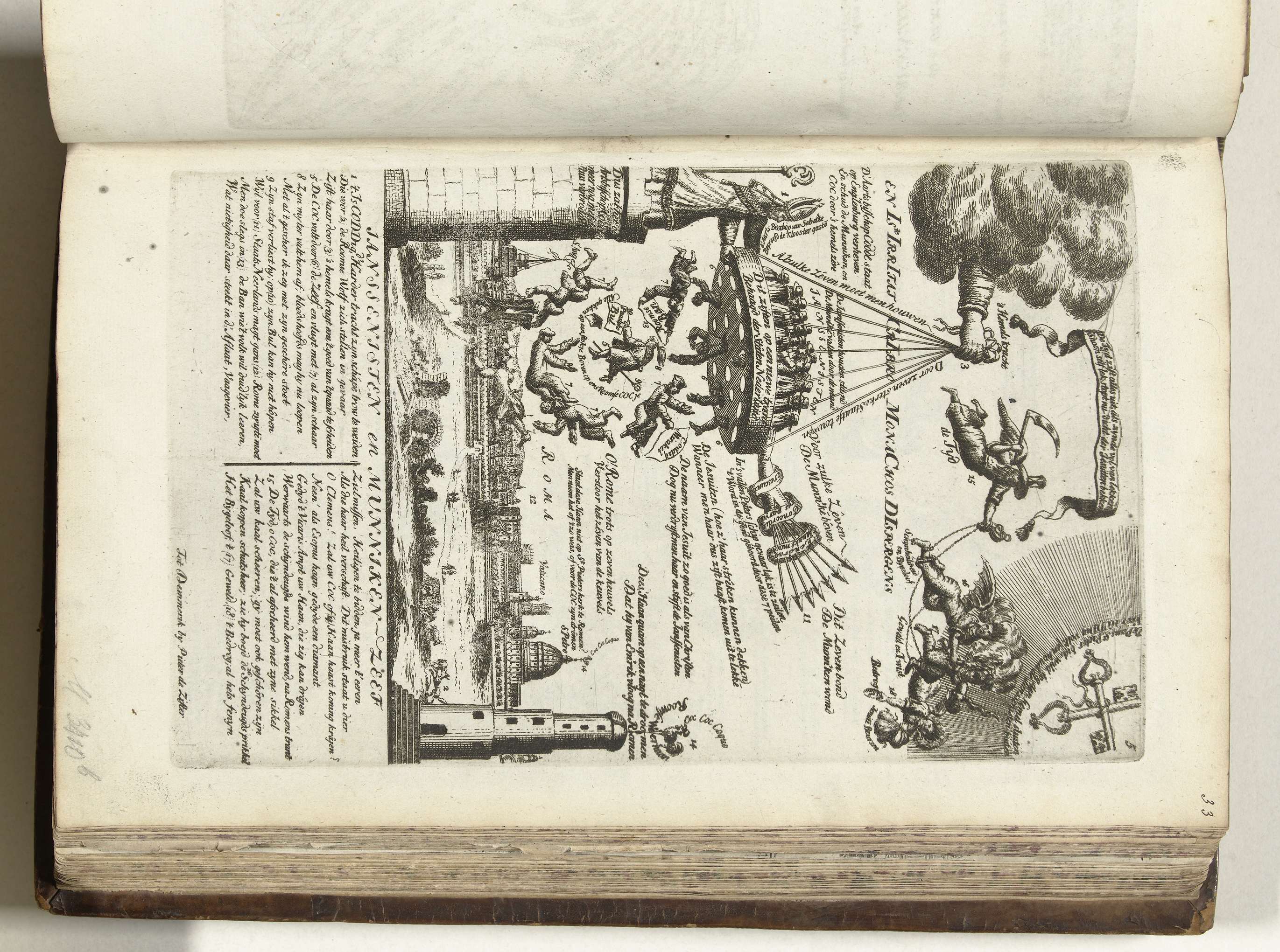 Petrus Codde schudt met hulp van de hand van de Republiek aan een grote zeef vastgehouden door de hand van God waaruit monniken vallen en waarin jansenisten overblijven, 1705. Blad nr. 5 in de serie van 13 bladen met spotprenten op de jezuïeten getiteld Roma Pertubata, 1707. Onderdeel van het prentwerk uitgegeven onder de verzameltitel ...