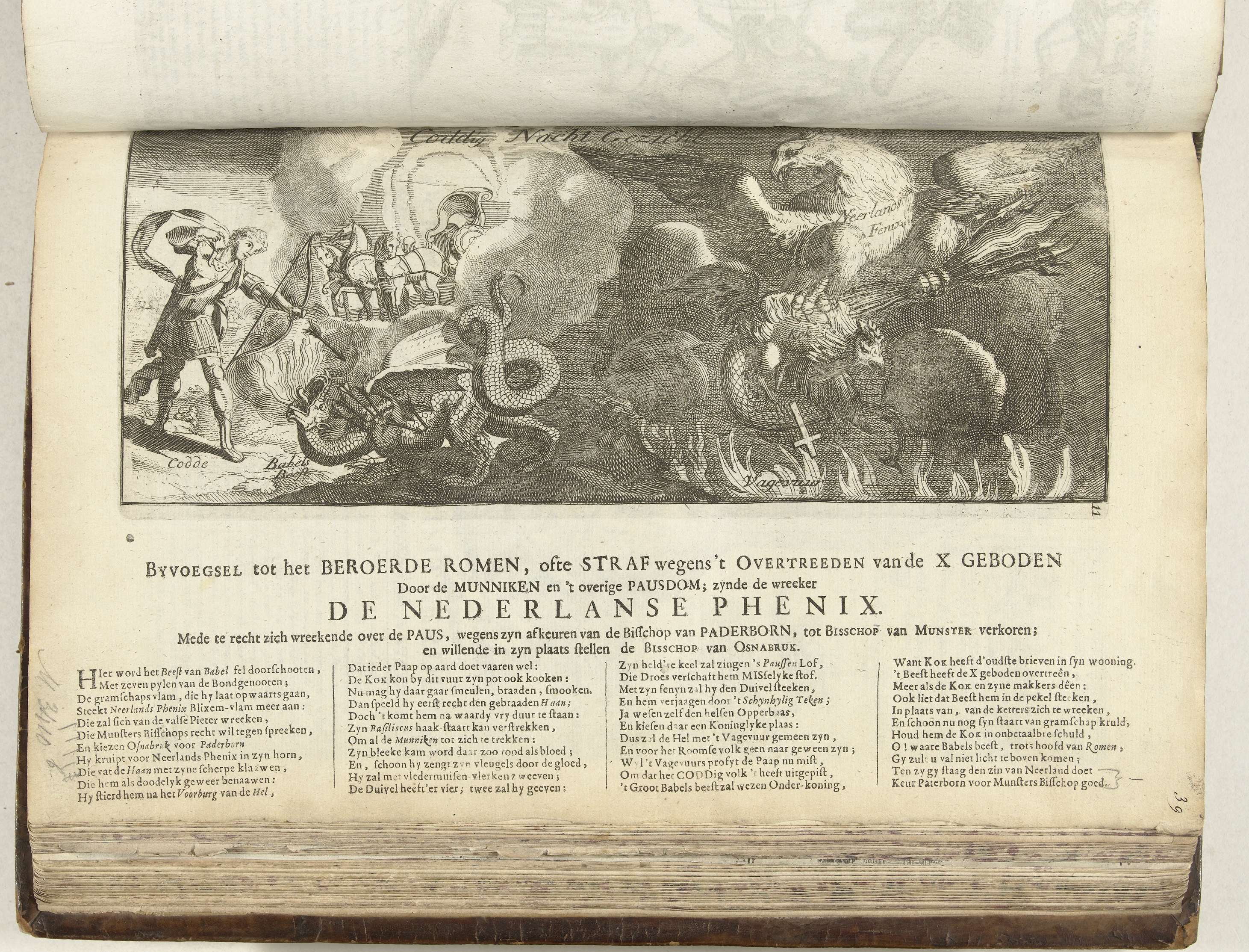 Coddig Nacht Gezicht, 1705. Petrus Codde doodt als Apollo de Python, hier aangeduid als het Babels Beest. Rechts werpt een adelaar (de Nederlandse feniks) een haan met een drakenstaart (Theodorus de Cock) in het vagevuur. Onder de plaat een vers in 4 kolommen. Blad nr. 11 in de serie van 13 bladen met spotprenten op ...