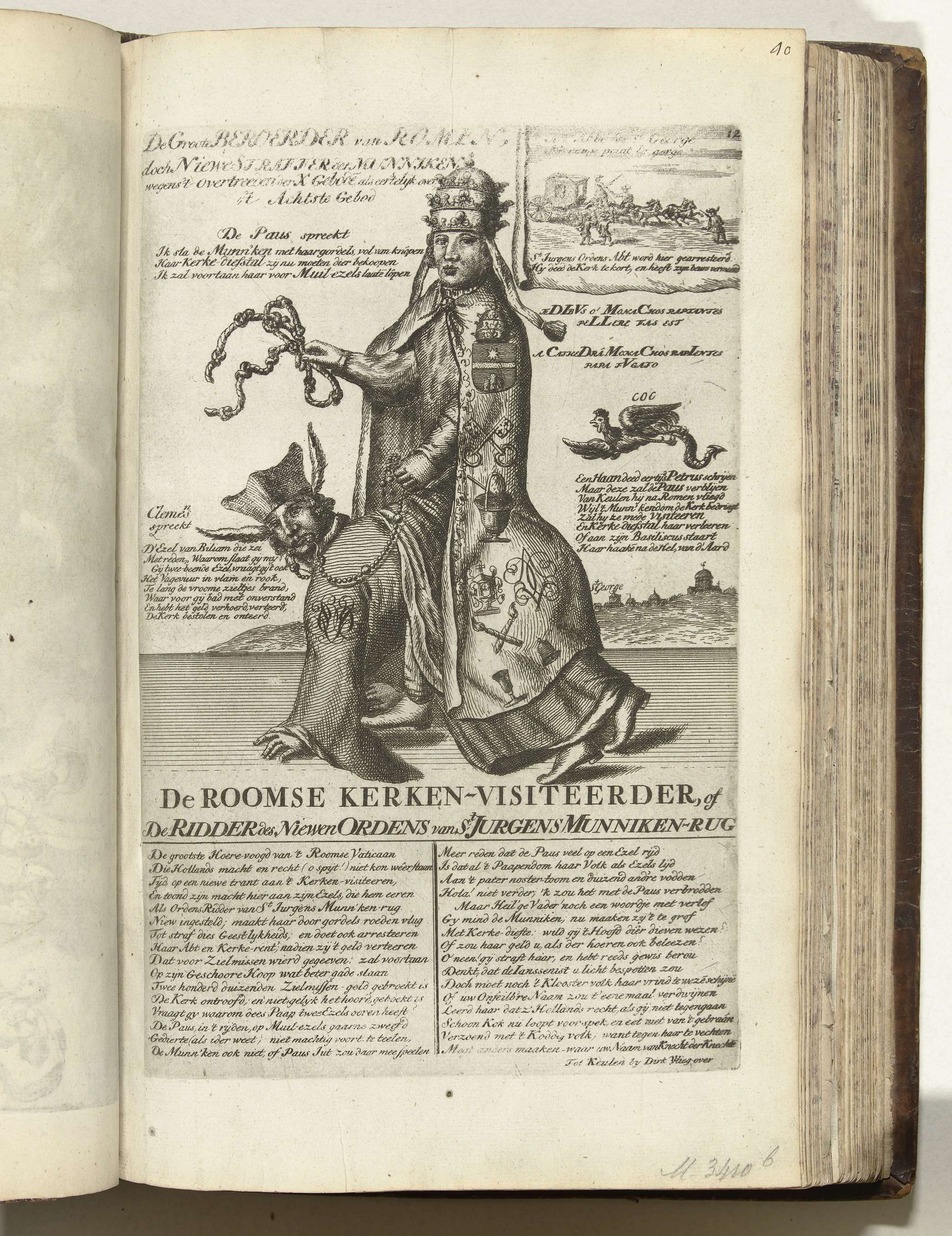 De Roomse kerkenvisiteerder, 1705. Paus Clemens XI paardje rijdend op de rug van een jezuïet. Rechts een vliegend monster half haan half draak (Theodorus de Cock). Blad nr. 12 in de serie van 13 bladen met spotprenten op de jezuïeten getiteld Roma Pertubata, 1707. Onderdeel van het prentwerk uitgegeven onder de verzameltitel 't Lust-Hof van ...