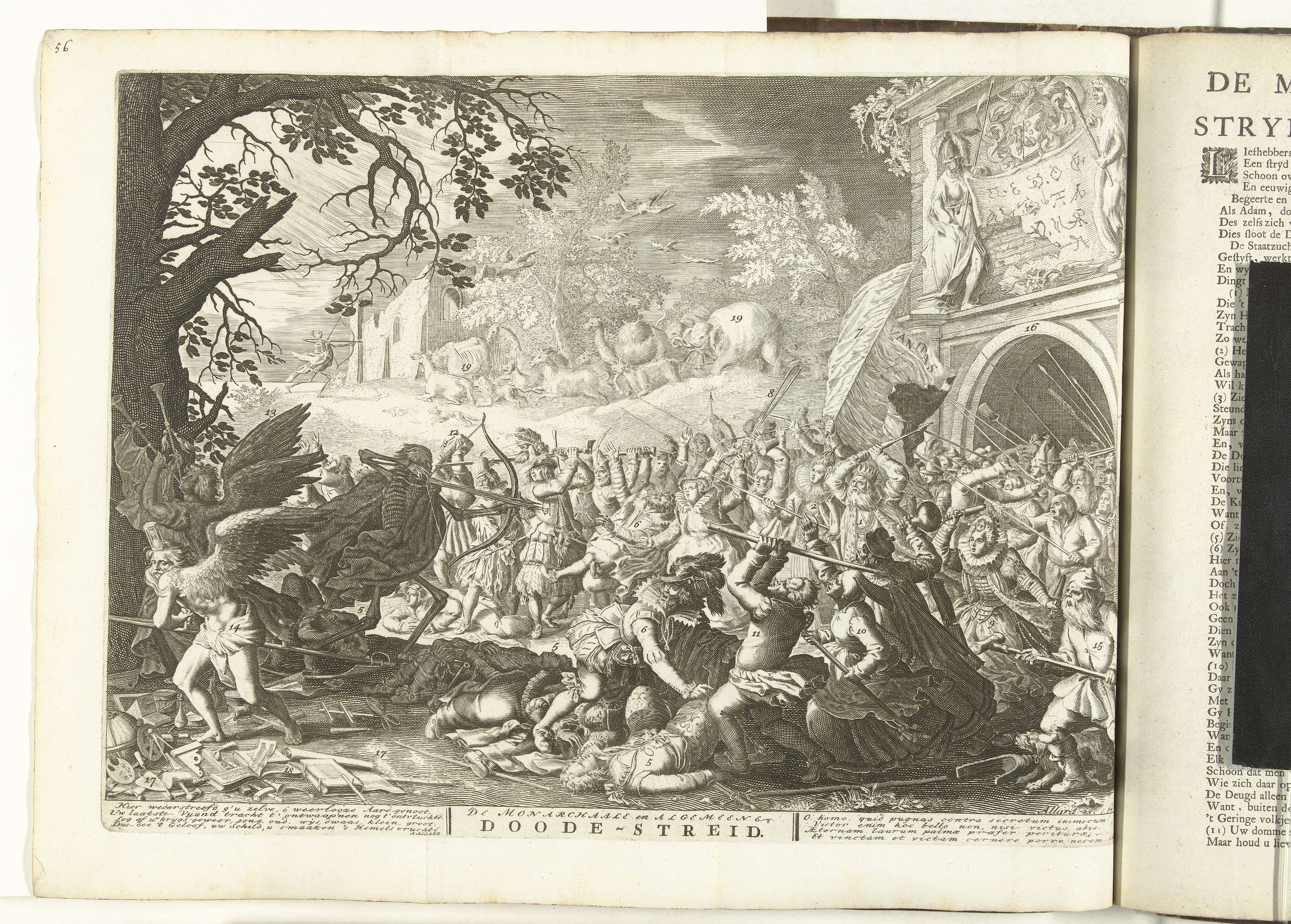 Allegorische voorstelling. De dood schiet zijn pijlen af op een gewapende menigte jonge en oude, arme en rijke mannen en vrouwen die uit een poort komen stormen, ca. 1707-1708. Genummerd: 8 en gemerkt: Pag. 19. Onderdeel van: De Standvastige Monarchye des Doods, een reeks van 8 oude platen met verzen aangepast voor gebruik als spotprenten ...