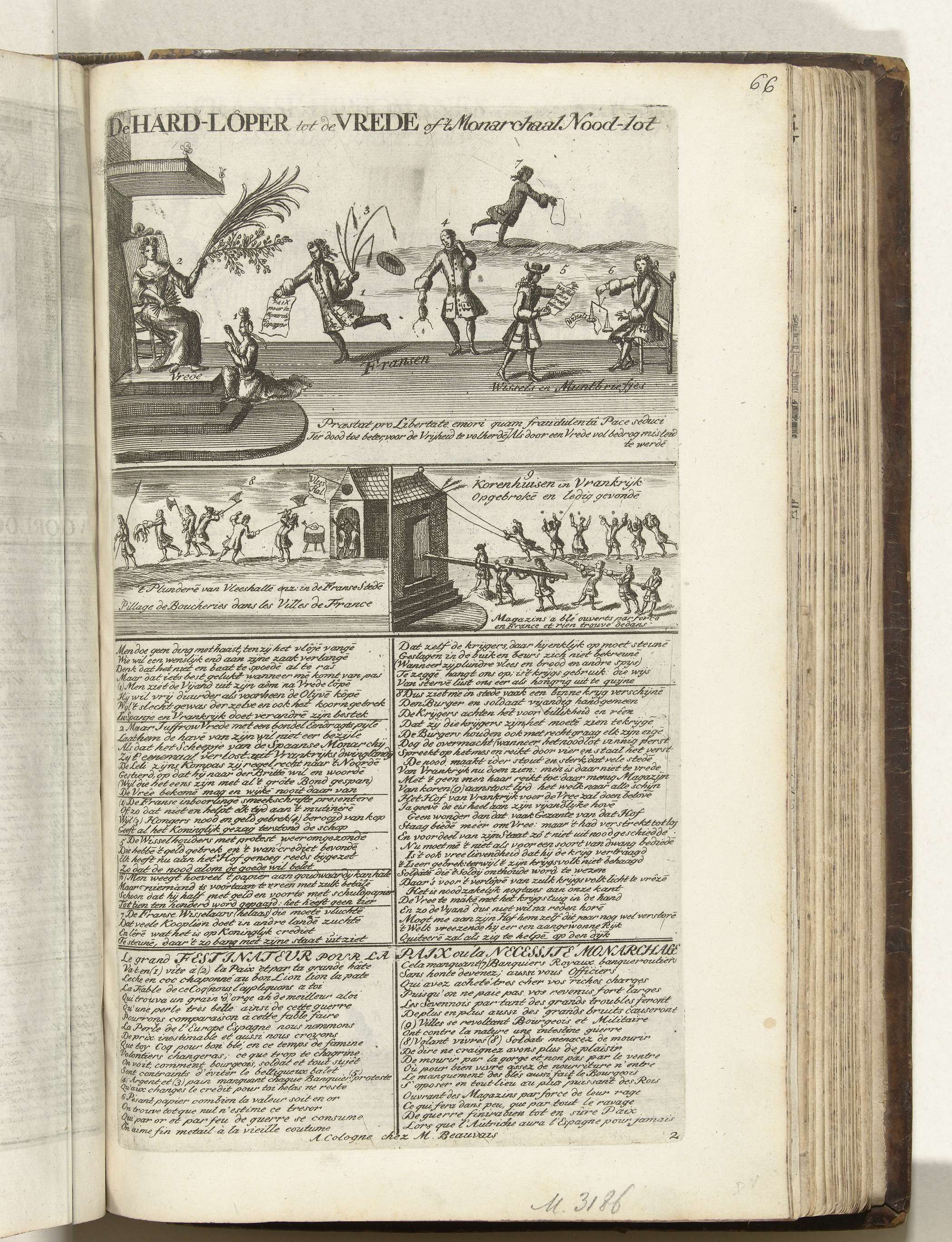 Spotprent met Frankrijk knielend voor de troon van de Vrede, onderaan twee kleinere scènes van het plunderen van vleeshallen en korenhuizen in Frankrijk gedreven door hongersnood. Genummerd rechtsonder: 2. Opschriften en verzen in de plaat in het Nederlands en Frans. Onderdeel van de Vorstelyke Staat-Balans, een reeks van 7 genummerde spotprenten op de Fransen in ...