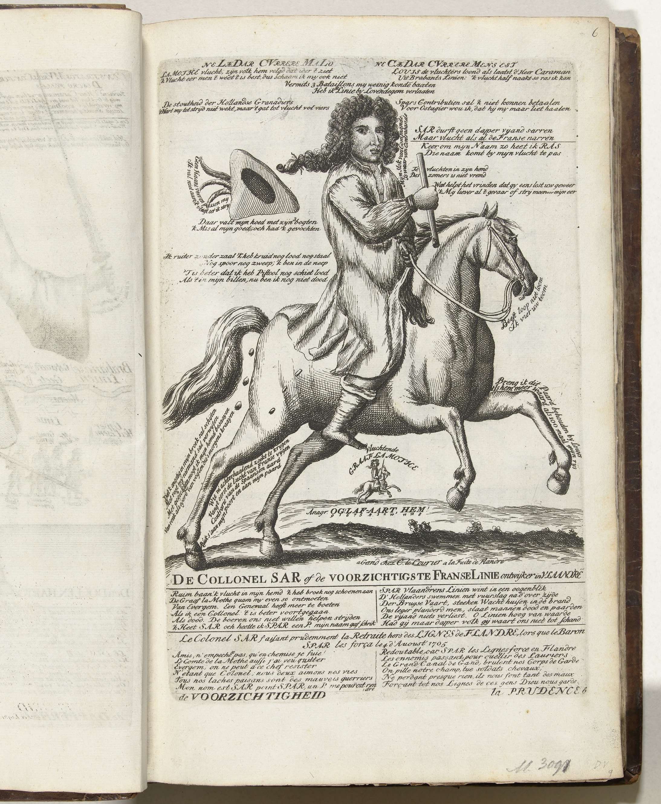 Spotprent op de vluchtende kolonel Sar bij het doorbereken van de Vlaamse Linies op 4 augustus door de Staatse generaal Baron Sparre (of Spar). Met verzen in het Nederlands en Frans in de plaat. Prent nr. 6 (de Voorzichtigheid - la Prudence) in de serie van 7 prenten in de Koninklyke Almanach van 1705 in ...