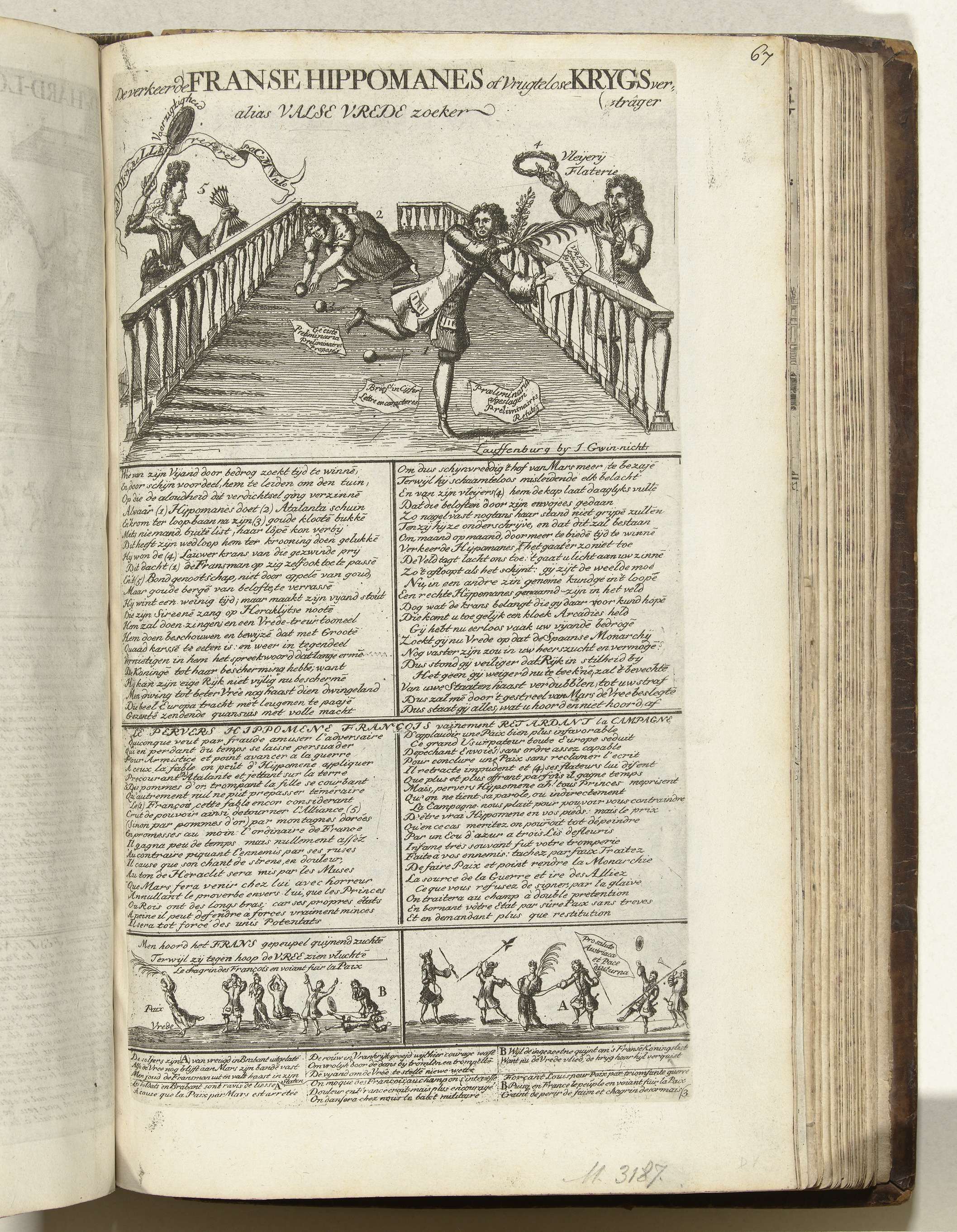 Allegorie op de afgebroken vredesonderhandelingen tussen de bondgenoten en Frankrijk in Den Haag in de vorm van de wedstrijd tussen Atalanta en Hippomenes. Genummerd rechtsonder: 3. Opschriften en verzen in de plaat in het Nederlands en Frans. Onderdeel van de Vorstelyke Staat-Balans, een reeks van 7 genummerde spotprenten op de Fransen in het jaar 1709 ...