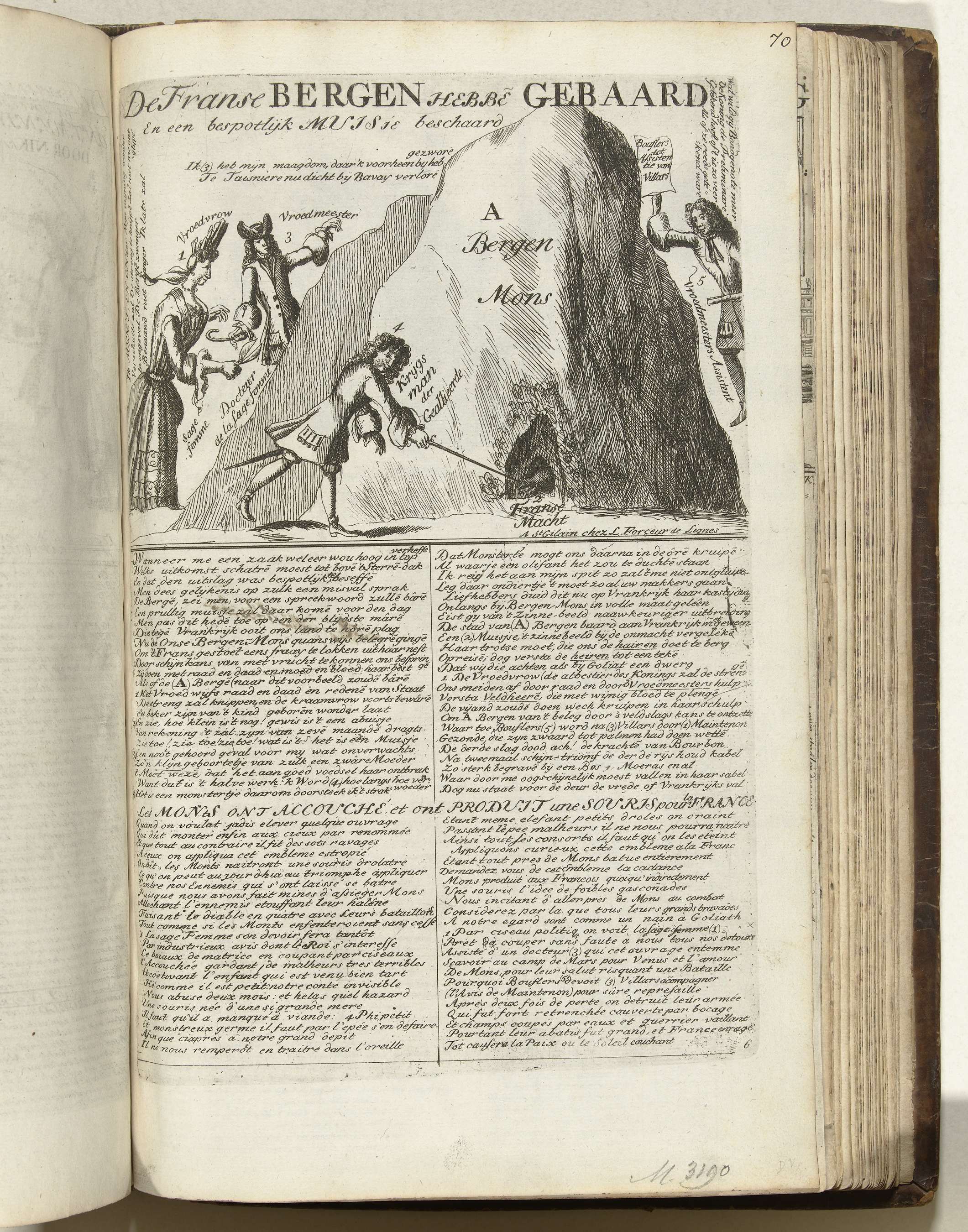 Spotprent op het Franse verlies van Mons (Bergen) aan de geallieerden in 1709. Uit een berg komt een muis (Franse Macht) tevoorschijn. Met opschriften en verzen in het Nederlands en Frans. Genummerd rechtsonder: 6. Onderdeel van de Vorstelyke Staat-Balans, een reeks van 7 genummerde spotprenten op de Fransen in het jaar 1709 van de Spaanse ...