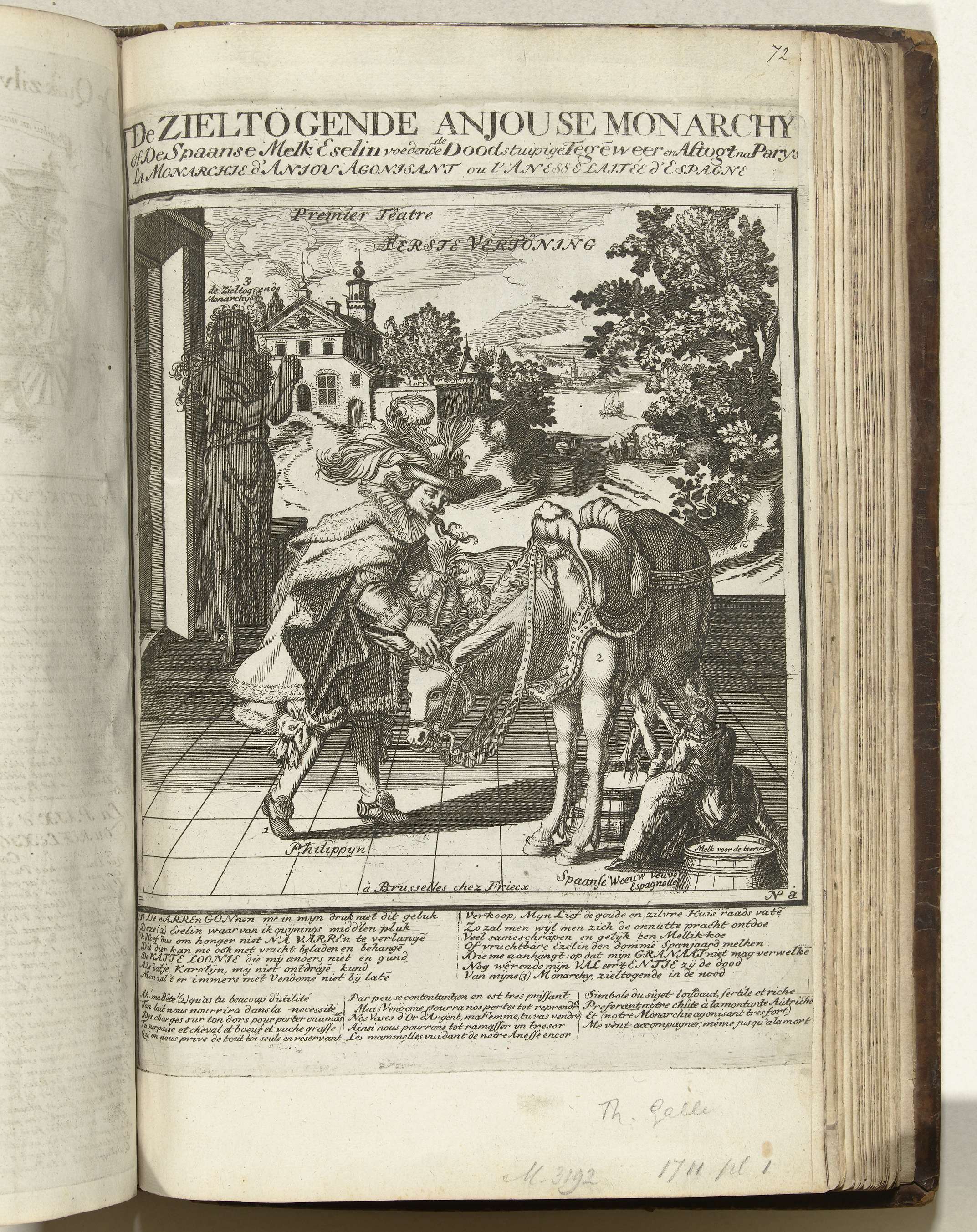 De zieltogende Anjouse Monarchie (plaat a), 1711. Eerste plaat in een groep van 4 allegorieën op het falen van de hertog van Anjou als koning Filips V van Spanje. De ezel (Spanje) wordt gemolken. Met opschriften en verzen in het Nederlands en Frans. Onderdeel van de Platen over 1711, een groep van 5 ongenummerde spotprenten ...