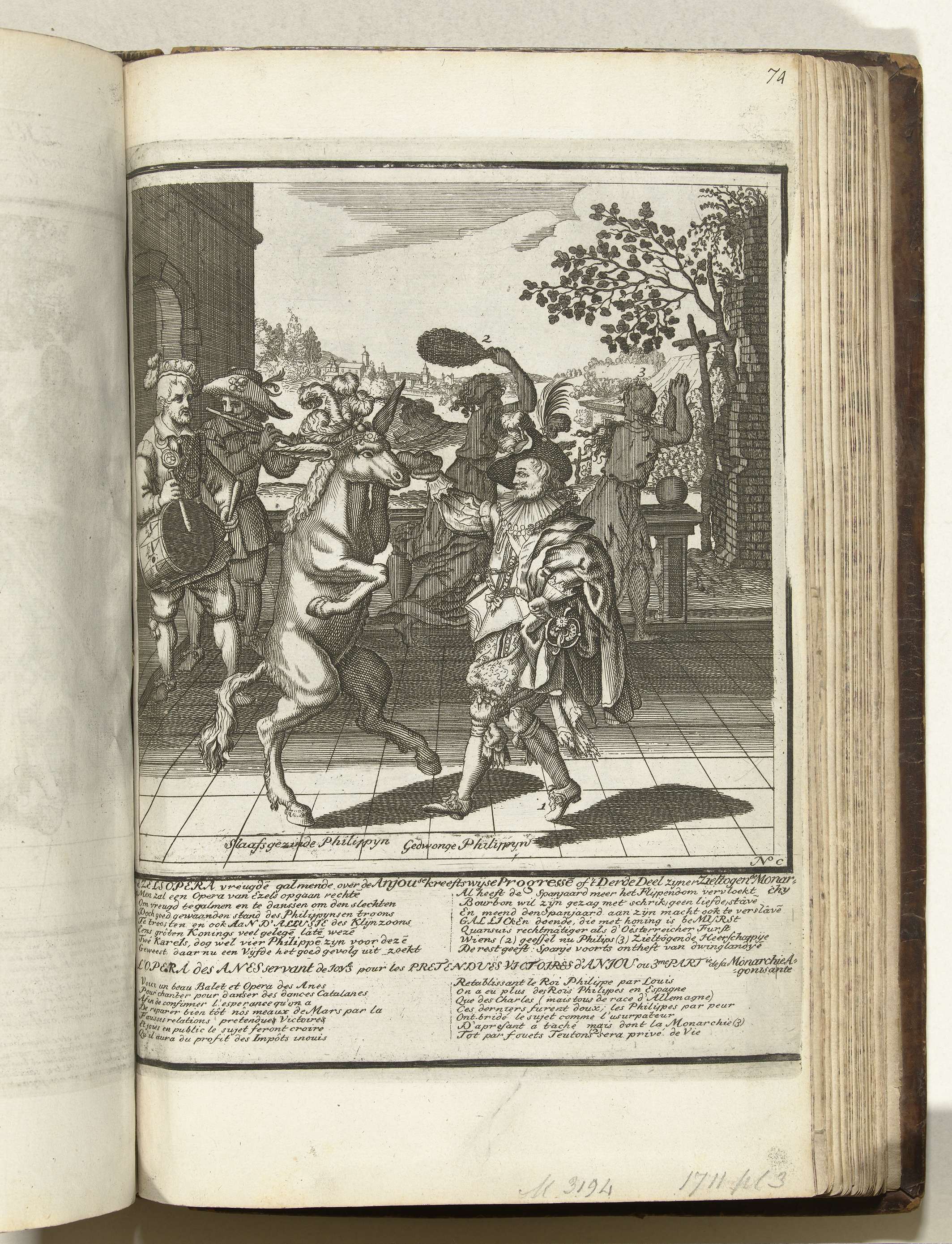 De zieltogende Anjouse Monarchie (plaat c), 1711. Derde plaat in een groep van 4 allegorieën op het falen van de hertog van Anjou als koning Filips V van Spanje. De ezel (Spanje) en de hertog dansend op een terras. Met opschriften en verzen in het Nederlands en Frans. Onderdeel van de Platen over 1711, een ...
