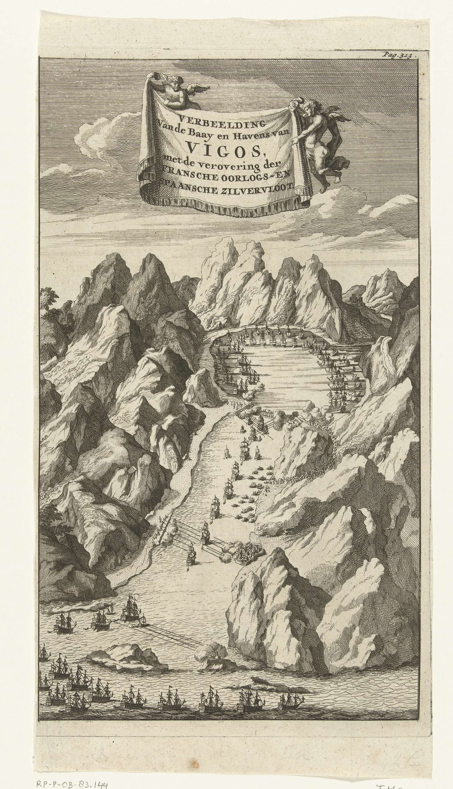 De verovering van de Spaanse Zilvervloot in de door een barrière afgesloten baai van Vigo door de gecombineerde Engelse en Nederlandse vloot, 23 oktober 1702. In de vlucht twee putti met een doek waarop de titel. Gemerkt rechtsboven: Pag. 313.