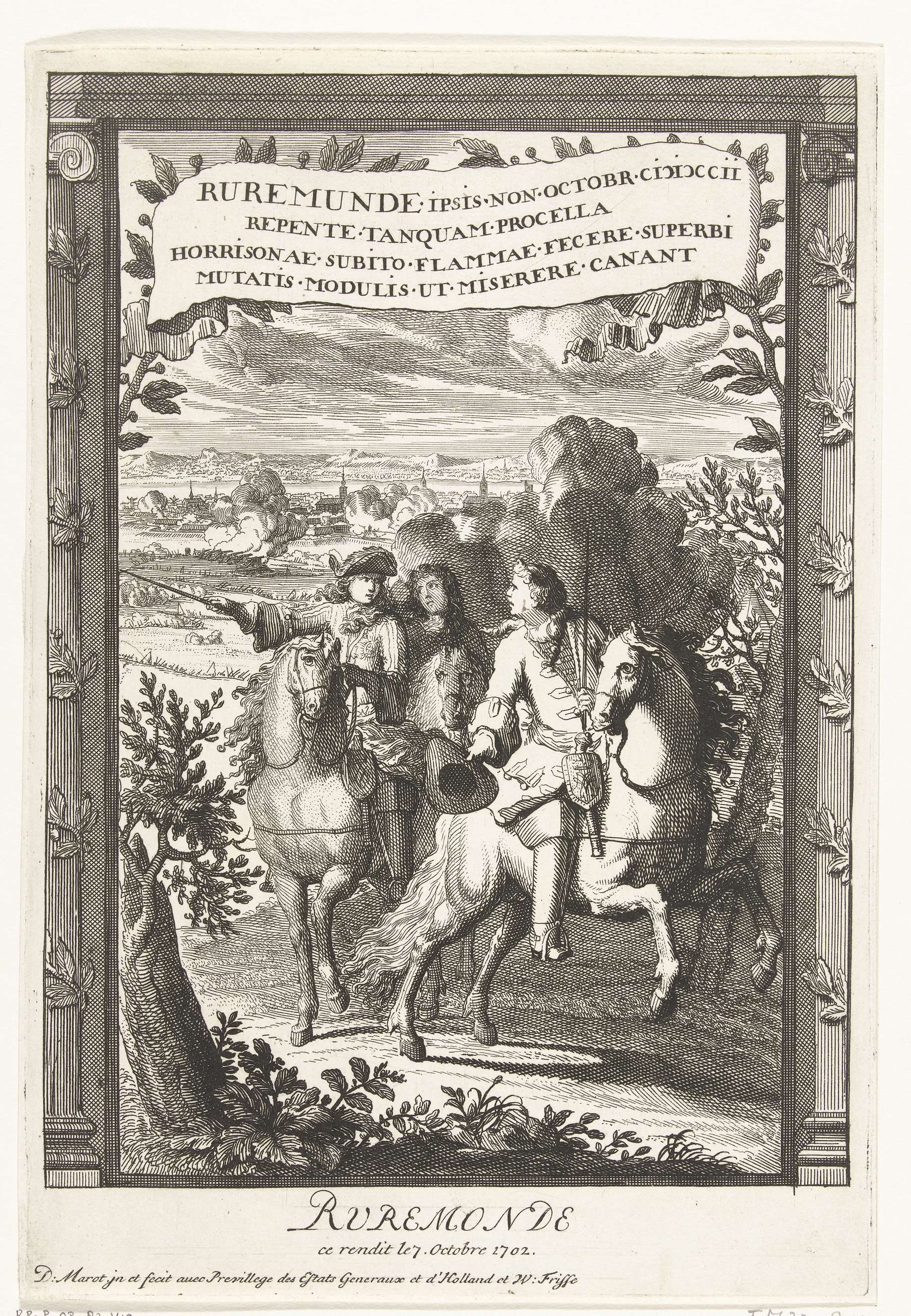 Paneel met een voorstelling van de overwinning te Roermond op 7 oktober 1702. Onderdeel van de decoraties op de stellage met de Tempel van Mars tijdens het vuurwerk op de Hofvijver op 13 december 1702 te Den Haag. De Tempel van Mars was versierd met acht panelen met voorstellingen van overwinningen van de geallieerden op ...