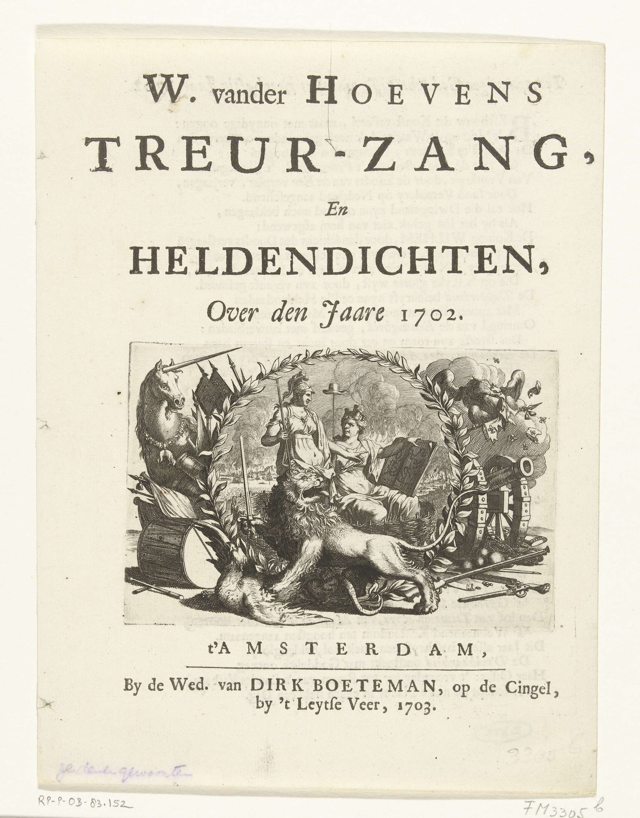 Titelpagina voor W. van der Hoevens Treur-Zang en Heldendichten, Over den Jaare 1702