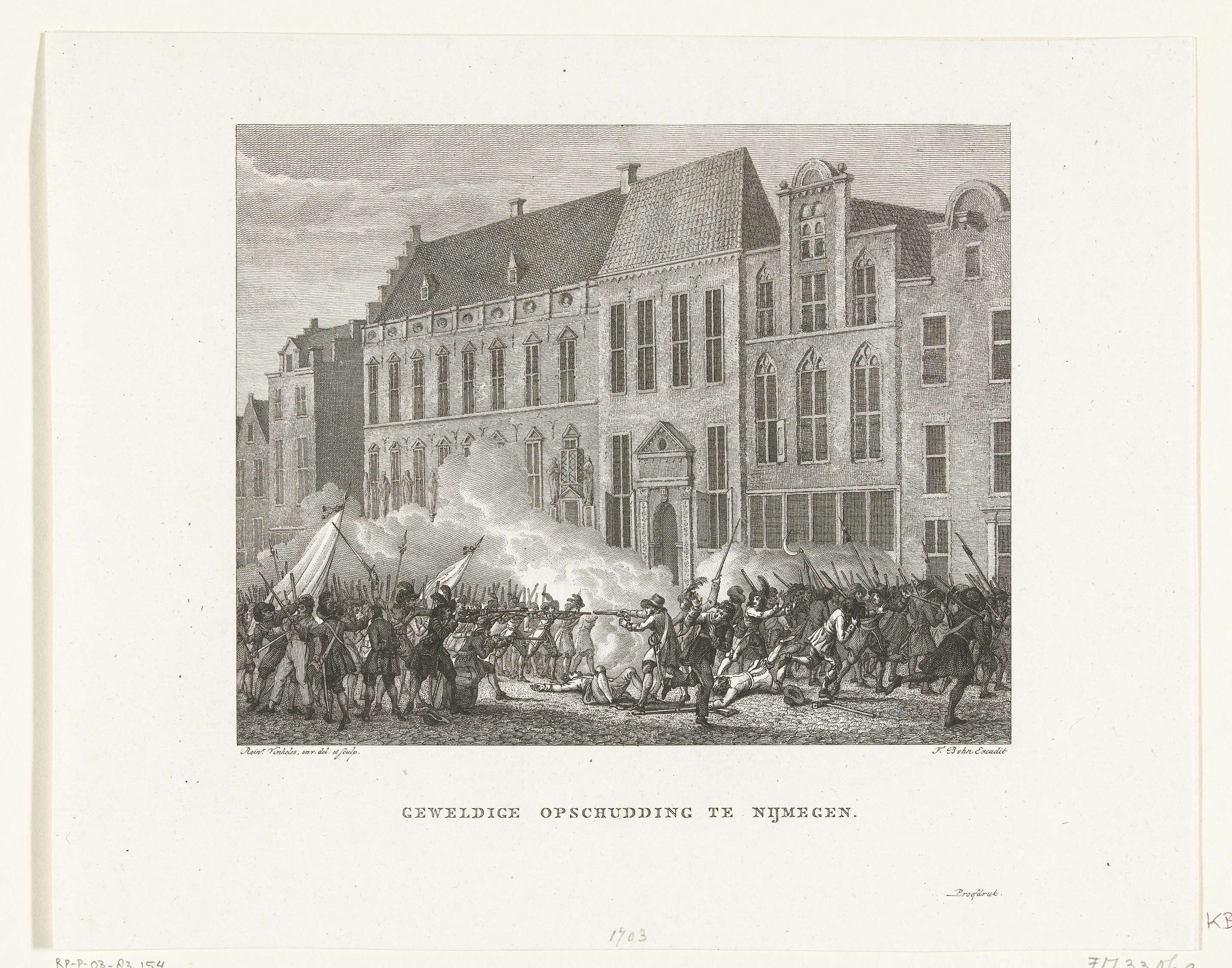Straatgevechten naar aanleiding van de magistraatsverandering te Nijmegen, 2 januari 1703. Groepen soldaten en burgers schieten naar elkaar op straat voor het stadhuis. Strijd tussen de aanhangers van de 'Oude Plooi' (de zittende regenten) en de 'Nieuwe Plooi' (gemeenlieden, nieuwe regenten) gesteund door de Maasschippers. Rechtsonder gemerkt: Proefdruk.