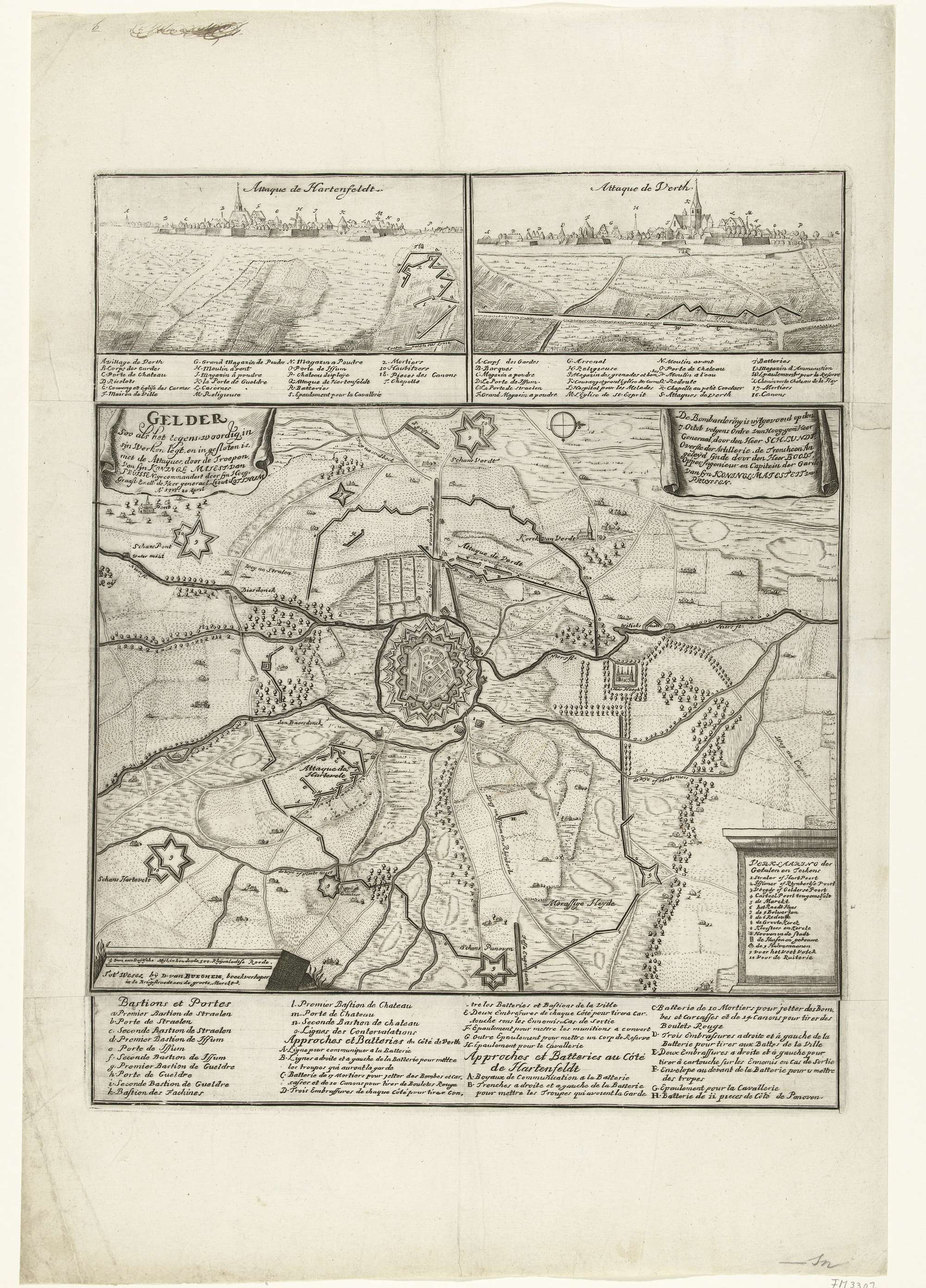 Kaart van Geldern en omgeving, tijdens het beleg door de Pruisische troepen onder generaal Lotthum op 20 april en het bombardement op 7 oktober 1703. Bovenaan en onderaan zijn stroken vastgeplakt met gezichten op de stad vanuit Hartenfeldt en Verth en de verklaringen in het Frans.