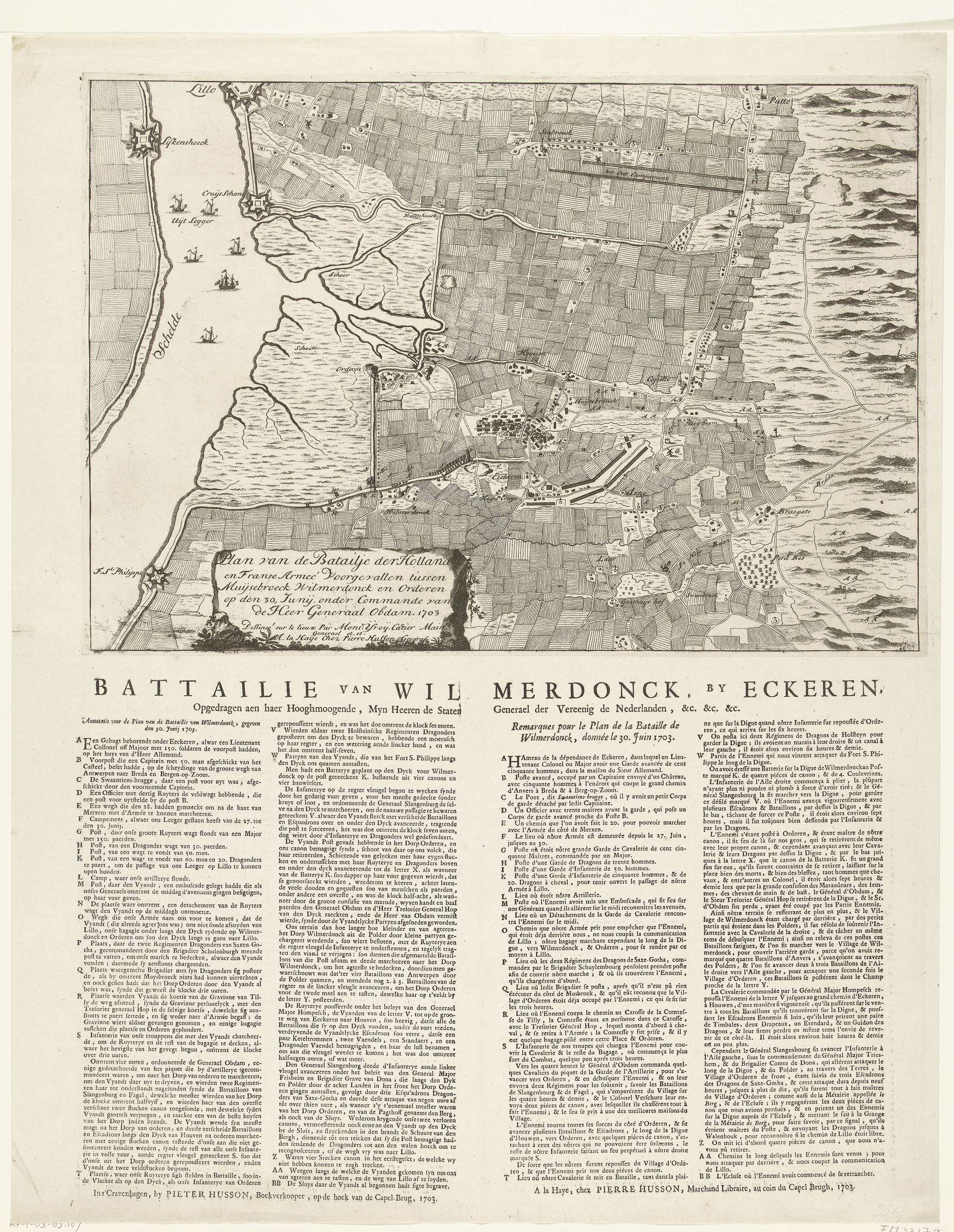 Kaart van de veldslag bij Ekeren aan de Schelde tussen de Nederlandse troepen onder Jacob II van Wassenaer Obdam en de Fransen, 30 juni 1703. Vastgeplakt onder de prent een tekstblad met legenda en beschrijving van het verloop van de strijd in 4 kolommen in Nederlands en Frans.