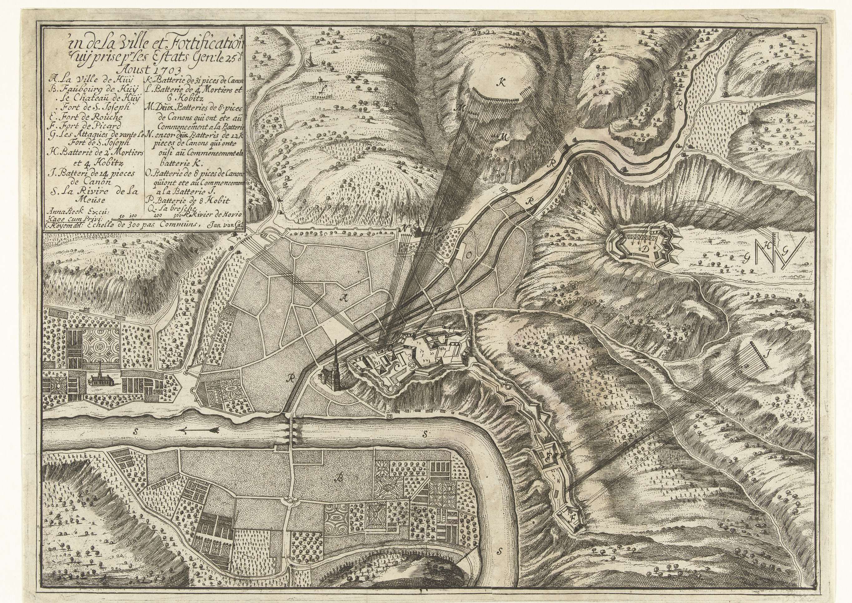 Kaart met de beschieting en inname van Huy door de Geallieerden op 25 augustus 1703. Linksboven een cartouche met titel en legenda A-Q in het Frans.