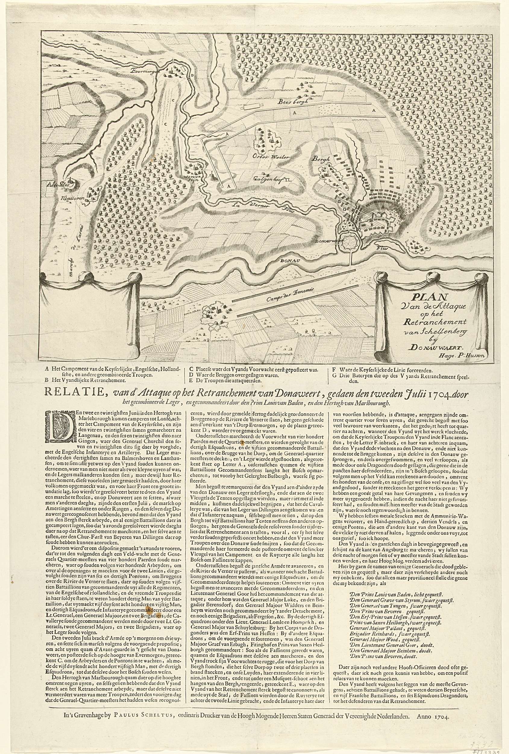 Kaart met de gevechten bij Donauwörth tussen de Geallieerden en de Beiersen en Fransen, 2 juli 1704. Onder de plaat is een tekstblad geplakt met een beschrijving in 3 kolommen in het Nederlands.