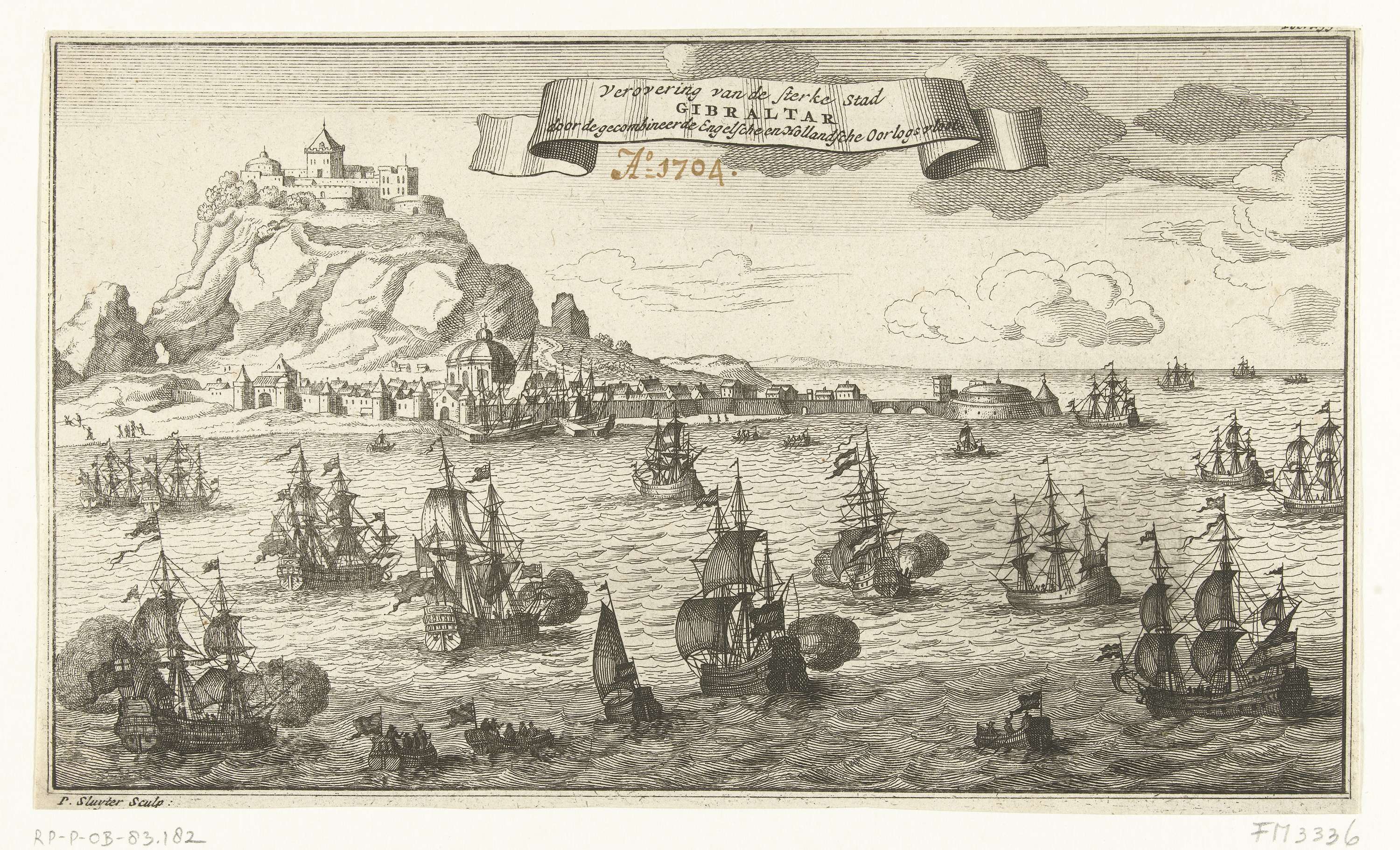 De verovering van Gibraltar door een gecombineerd Engels-Nederlandse vloot, 3 augustus 1704. Met de stad en het kasteel op de rots, op de voorgrond de zeeslag. Met pen in de voorstelling geschreven: Ao. 1704.