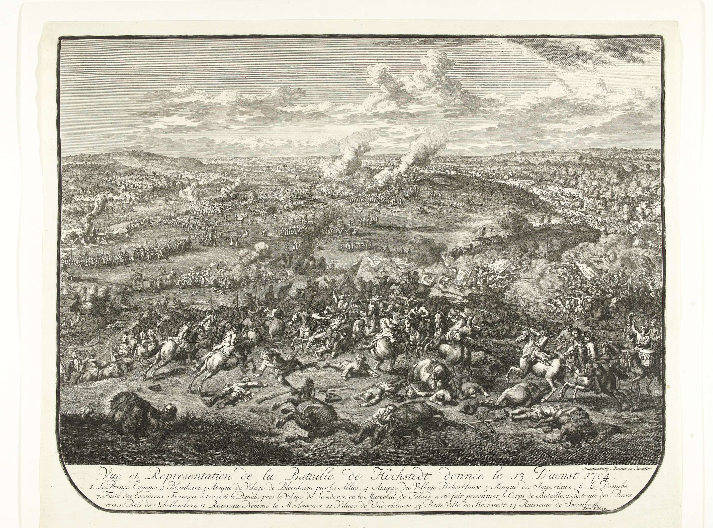 Grote voorstelling van de slag bij Höchstädt (slag bij Blenheim) met een overwinning van de Geallieerden op de Fransen, 13 augustus 1704. Op de voorgrond prins Eugenius van Savoye. Gemerkt rechtsonder: Tom. I. No. 19.