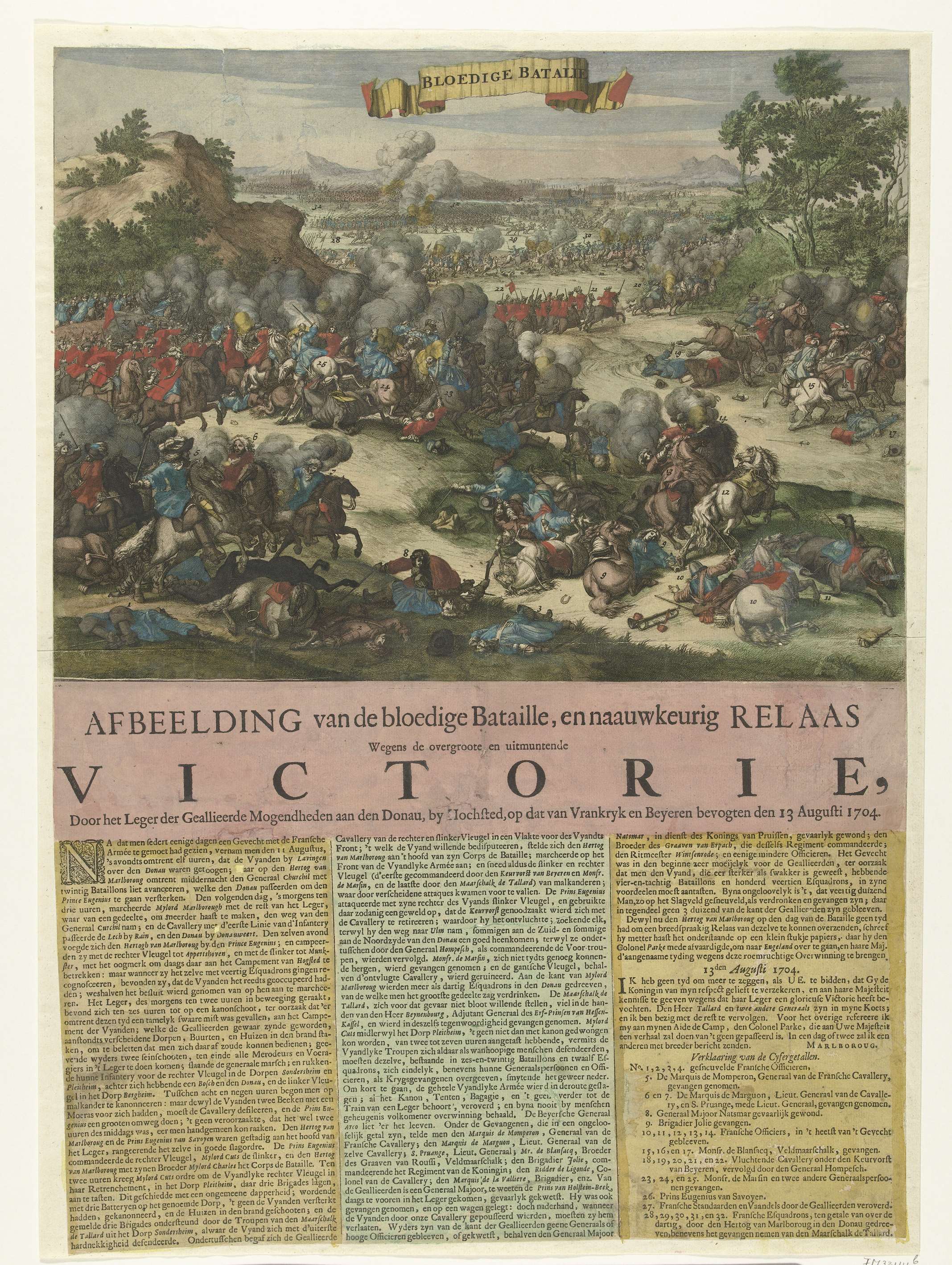 De slag bij Höchstädt (slag bij Blenheim) met een overwinning van de Geallieerden op de Fransen, 13 augustus 1704. Gedrukt op het blad onder de plaat een beschrijving in 3 kolommen in het Nederlands.