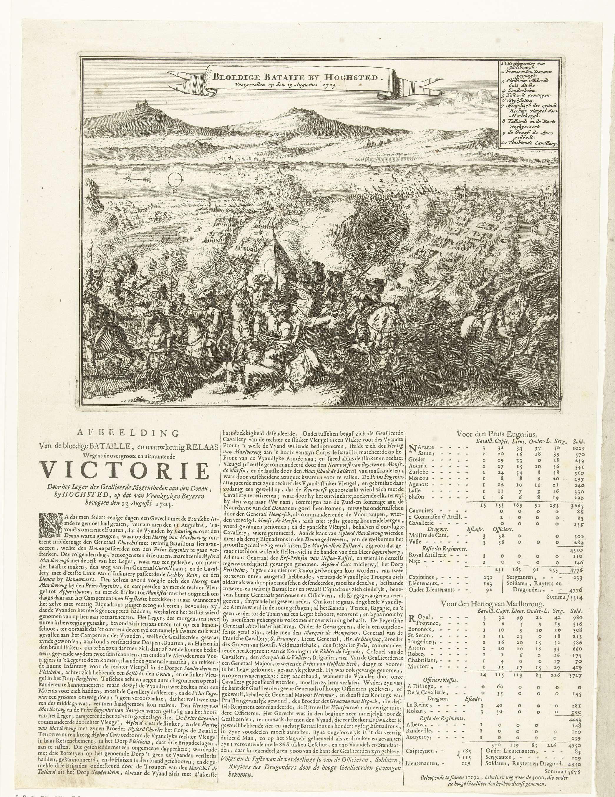 De slag bij Höchstädt (slag bij Blenheim) met een overwinning van de Geallieerden op de Fransen, 13 augustus 1704. Gedrukt op het blad onder de plaat een tekst in 3 kolommen met een beschrijving in 2 kolommen en een kolom met een overzicht van de aantallen door de Geallieerden gevangengenomen officieren en soldaten per bevelhebber, ...