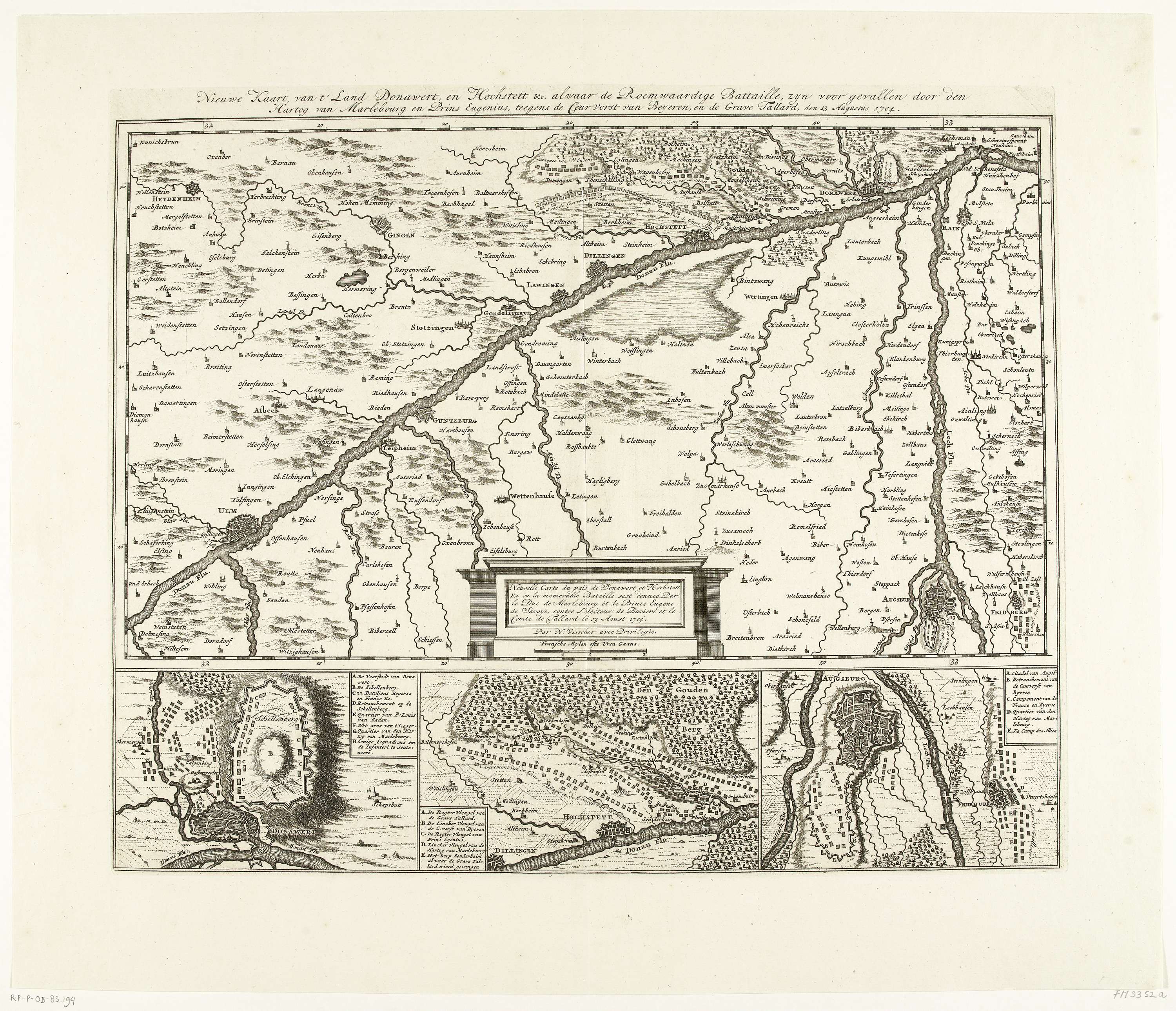 Kaart van Donawert, de streek rondom de Donau tussen Donauwörth en Ulm, locatie van de slag bij Höchstädt (slag bij Blenheim) met een overwinning van de Geallieerden op de Fransen en de Beiersen, 13 augustus 1704. Onderaan drie deatils van Schellenberg, Hochstett en Augsburg.