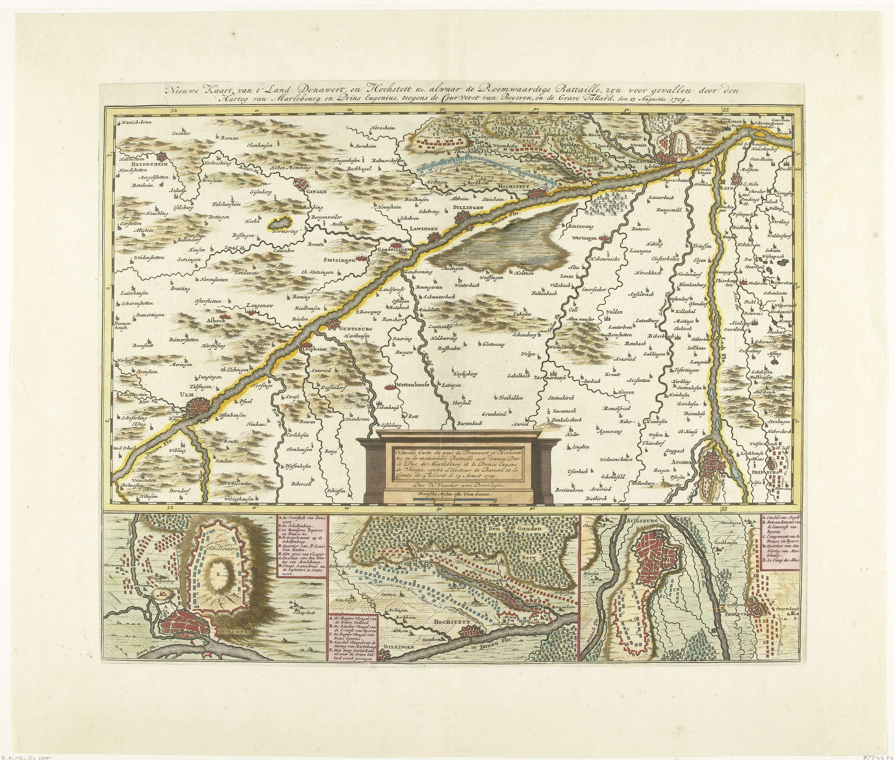 Kaart van Donawert, de streek rondom de Donau tussen Donauwörth en Ulm, locatie van de slag bij Höchstädt (slag bij Blenheim) met een overwinning van de Geallieerden op de Fransen en de Beiersen, 13 augustus 1704. Onderaan drie deatils van Schellenberg, Hochstett en Augsburg.