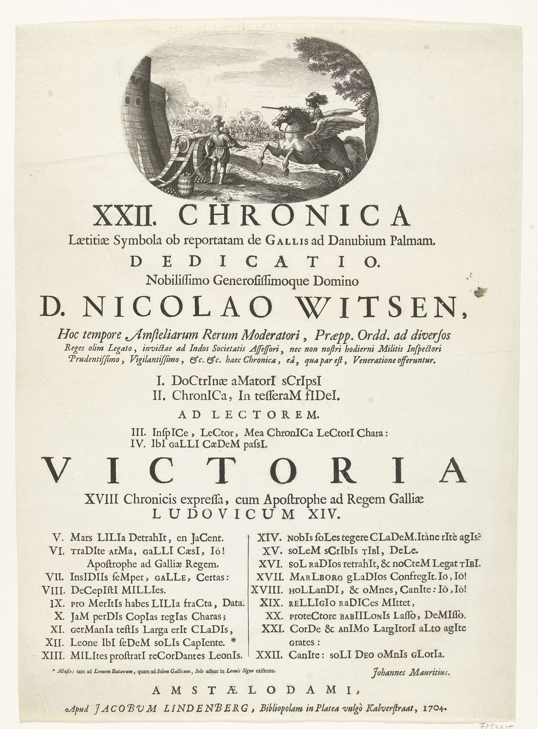 Tijdvers in 22 regels in het Latijn op het jaar 1704 en de slag bij Höchstädt op 13 augustus 1704 waar de Geallieerden de Fransen en de Beiersen versloegen. Bovenaan een medaillon met Bellona op Pegasus bij een veldslag.