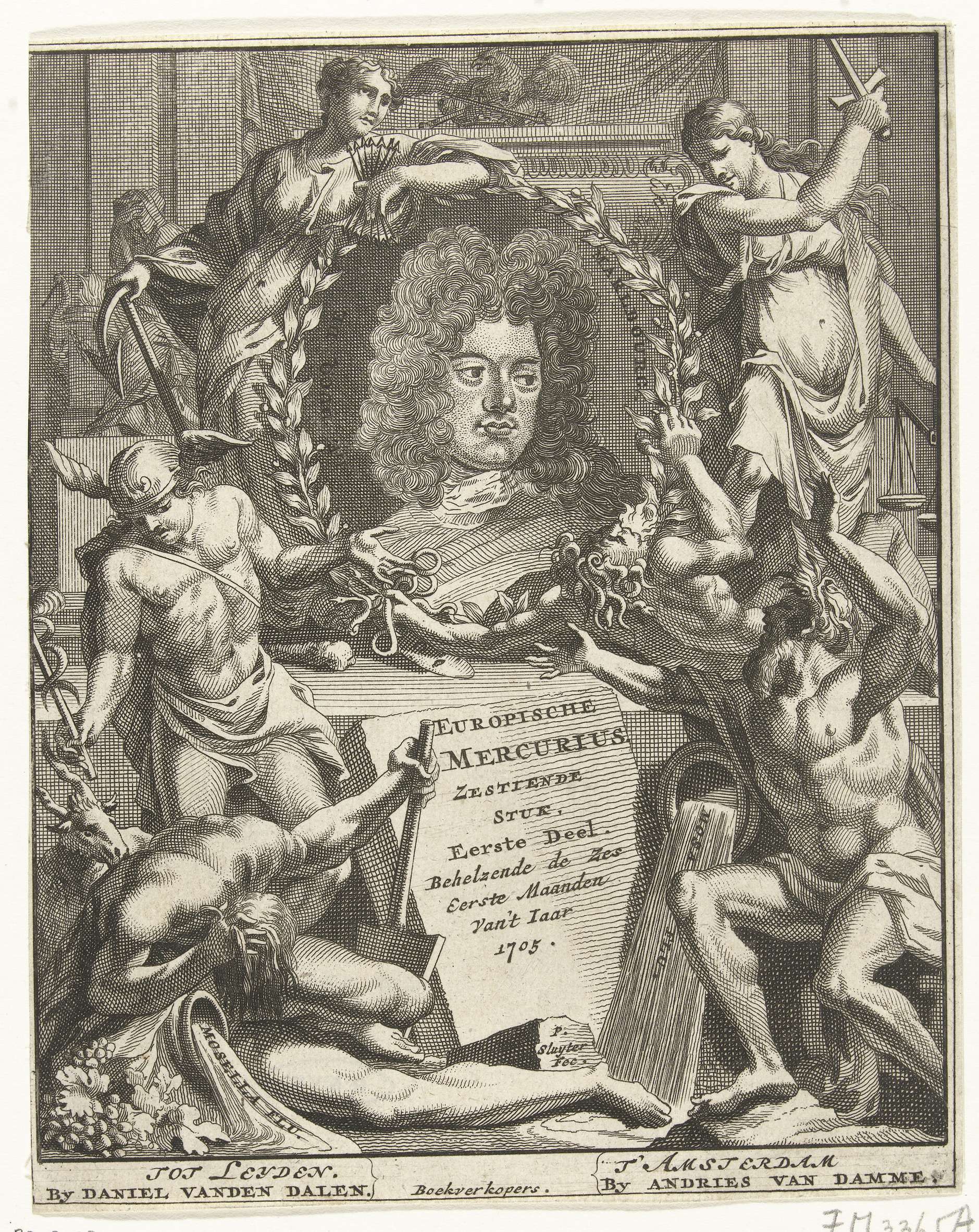 Titelpagina van de Europische Mercurius, het eerste deel met de eerste zes maanden van het jaar 1705. Portret van de hertog van Marlborough omgeven door Mercurius, Hoop, Rechtvaardigheid en de stroomgoden van de Mosel en de Maas.