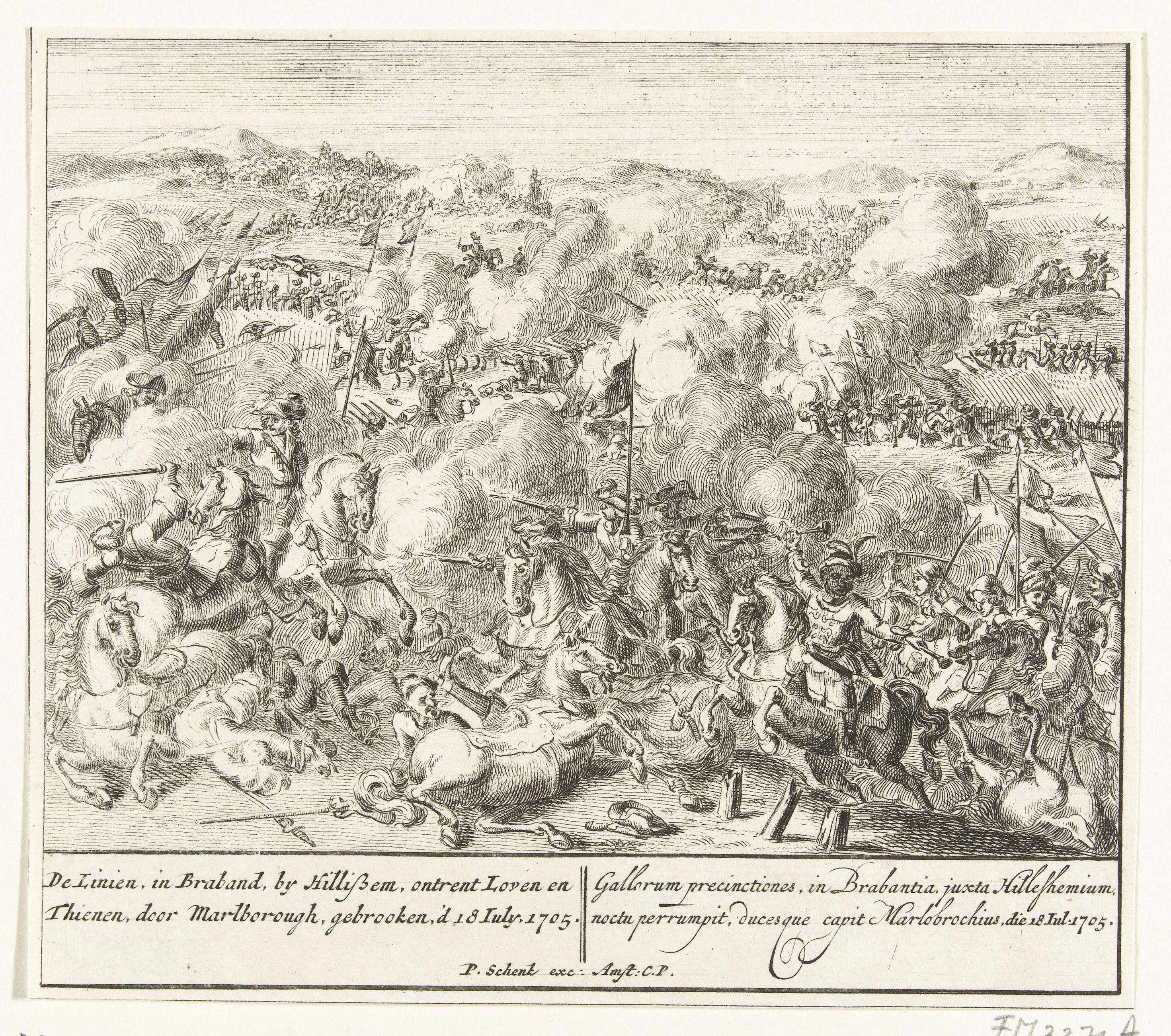 Het doorbreken door de Geallieerden van de Franse Linies in Brabant met de slag bij Eliksem bij Tienen, 18 juli 1705. Ook uitgegeven als een van de negen voorstellingen op een groot blad met gebeurtenissen uit het jaar 1705 van de Spaanse Successieoorlog.