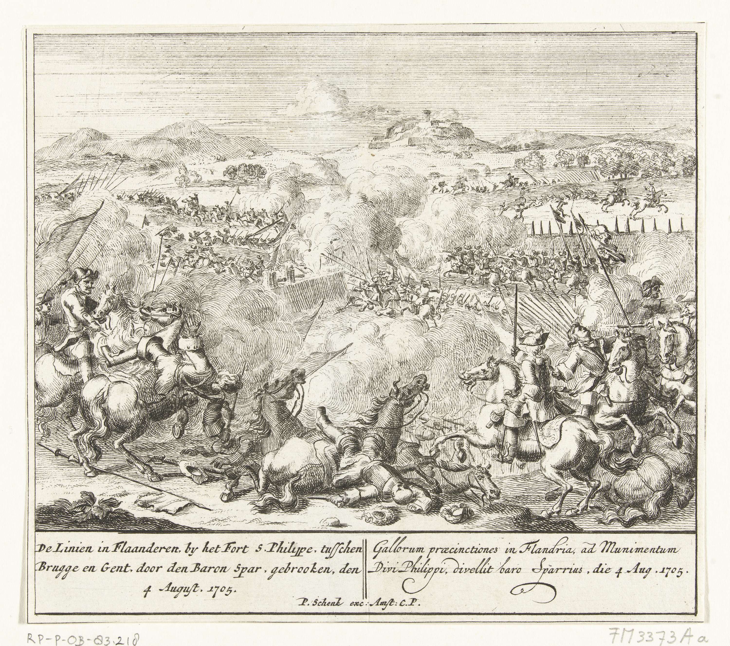 Het doorbreken door de Geallieerden onder baron Sparre van de Franse Linies in Vlaanderen bij Fort Sint-Filips (Fort Saint-Philippe), 4 augustus 1705. Ook uitgegeven als een van de negen voorstellingen op een groot blad met gebeurtenissen uit het jaar 1705 van de Spaanse Successieoorlog.