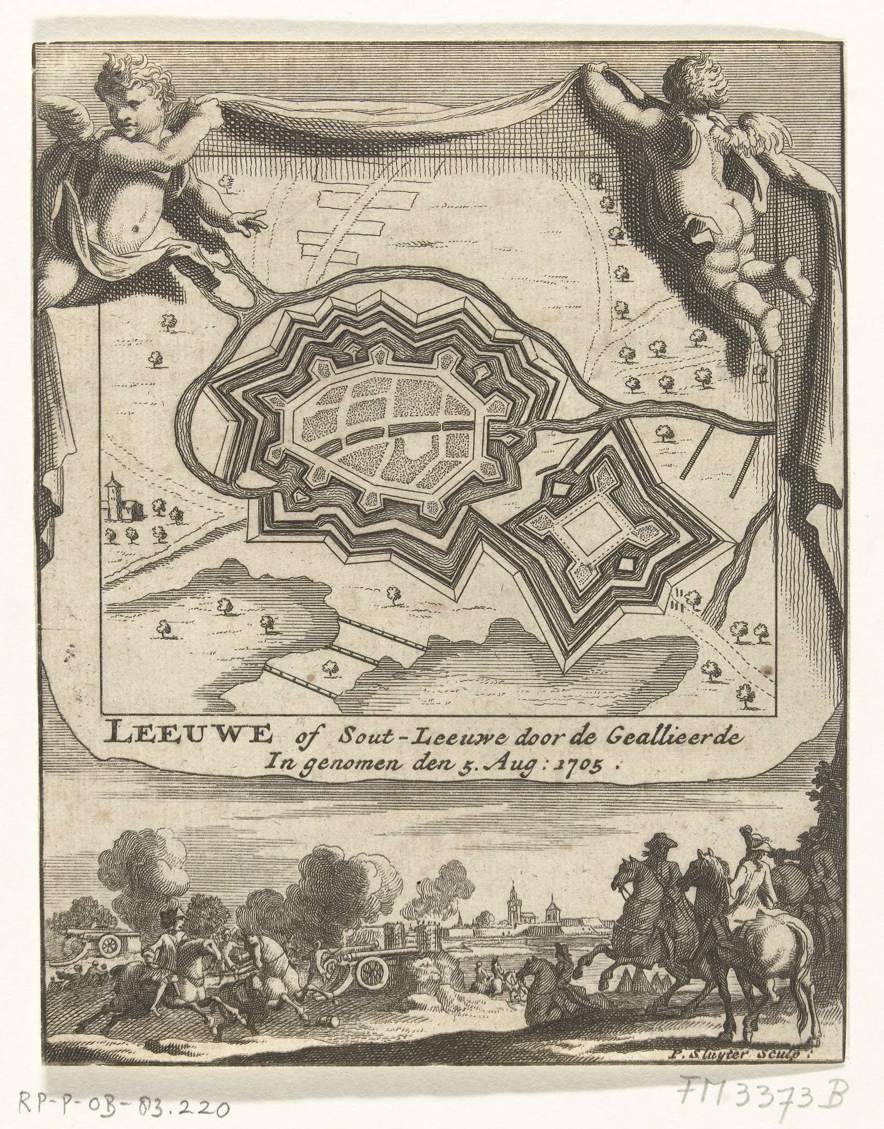 Plattegrond van de versterkingen om de plaats Zoutleeuw, veroverd op de Fransen door de Geallieerden, 5 augustus 1705. Waarschijnlijk de titelpagina van de Europische Mercurius voor de tweeede helft van 1705.