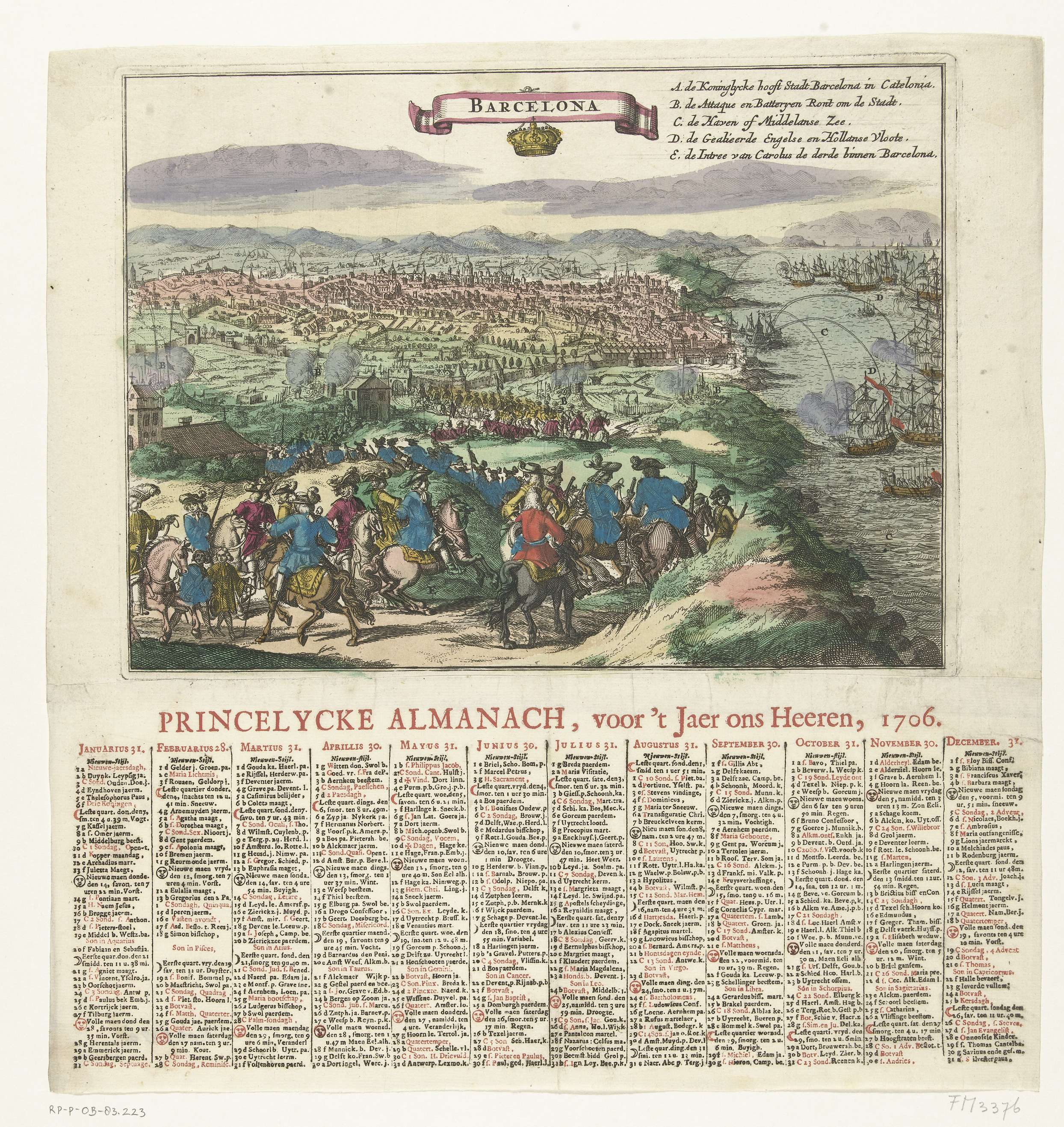 Almanak voor het jaar 1706, vastgeplakt onder een blad met een voorstelling van de verovering van Barcelona na een beleg door de Geallieerden, 14 oktober 1705.