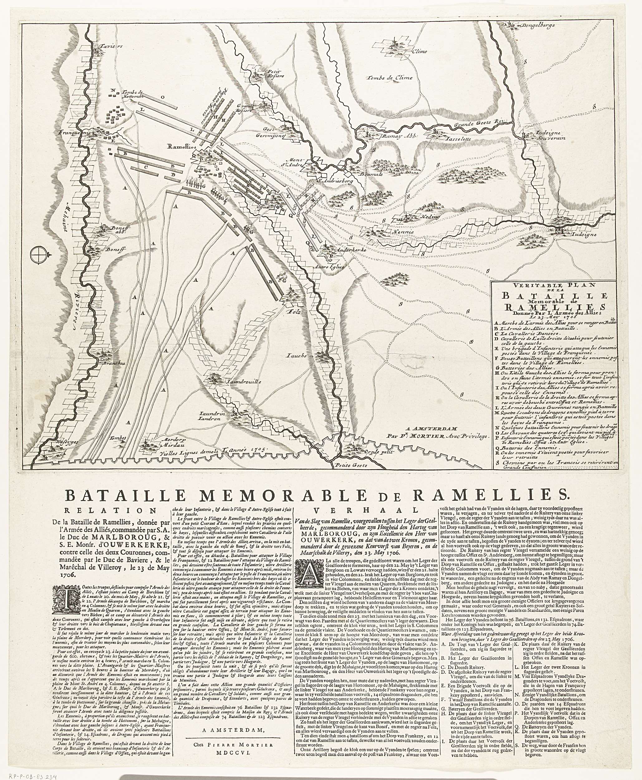 Kaart van de slag bij Ramillies tussen de Geallieerden onder de hertog van Marlborough en de Heer van Ouwerkerk en de Fransen en Spanjaarden onder de keurvorst van Beieren en de hertog van Villeroy, 23 mei 1706. Gedrukt op het blad onder de plaat een tekst in 4 kolommen in het Frans en Nederlands.