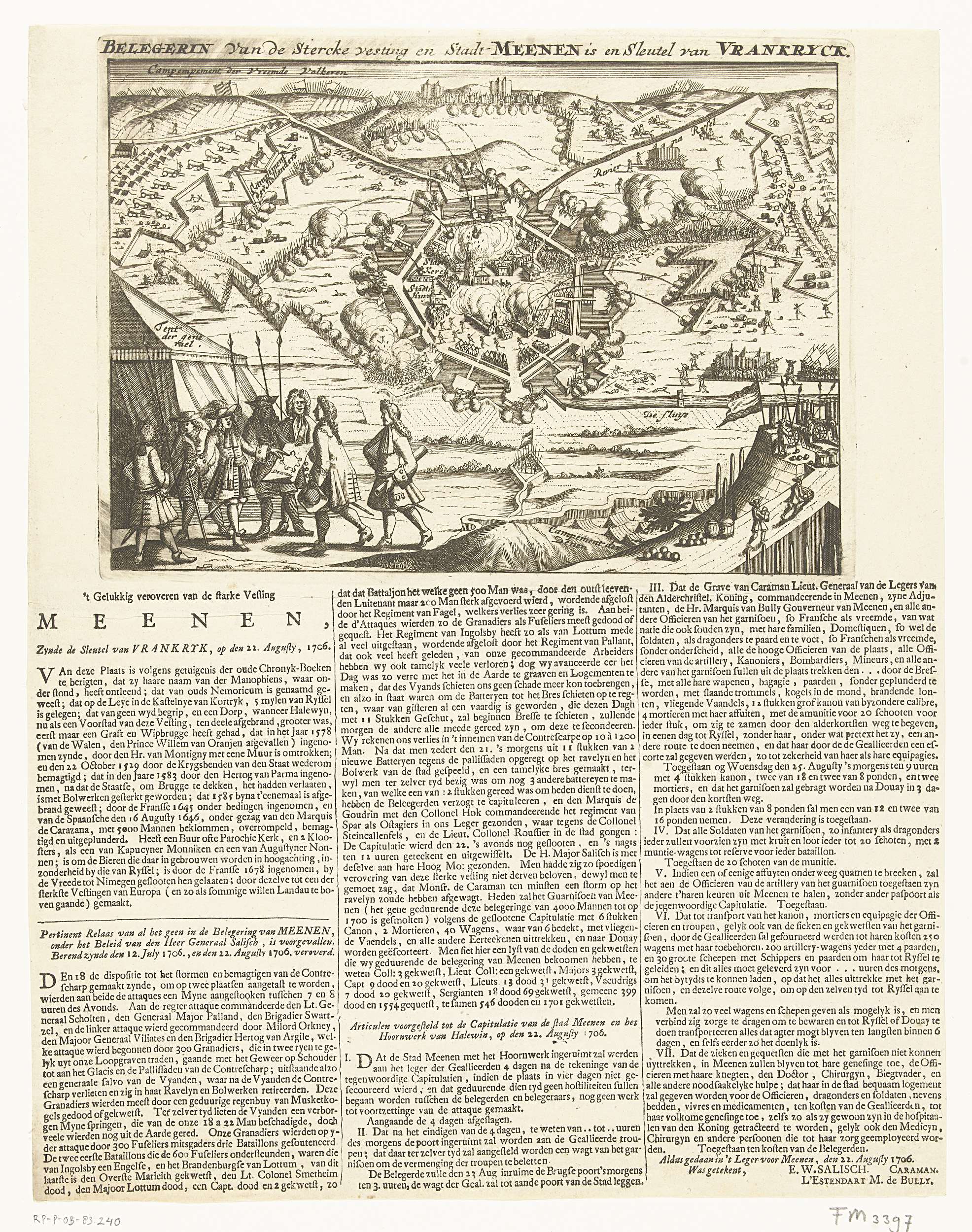 Plan van het beleg van Menen door de Geallieerden onder generaal E.W. von Salisch, ingenomen op 22 augustus 1706. Op de voorgrond overleg tussen geallieerde legeraanvoerders bij een legertent. Gedrukt op het blad onder de plaaat een tekst in 3 kolommen.