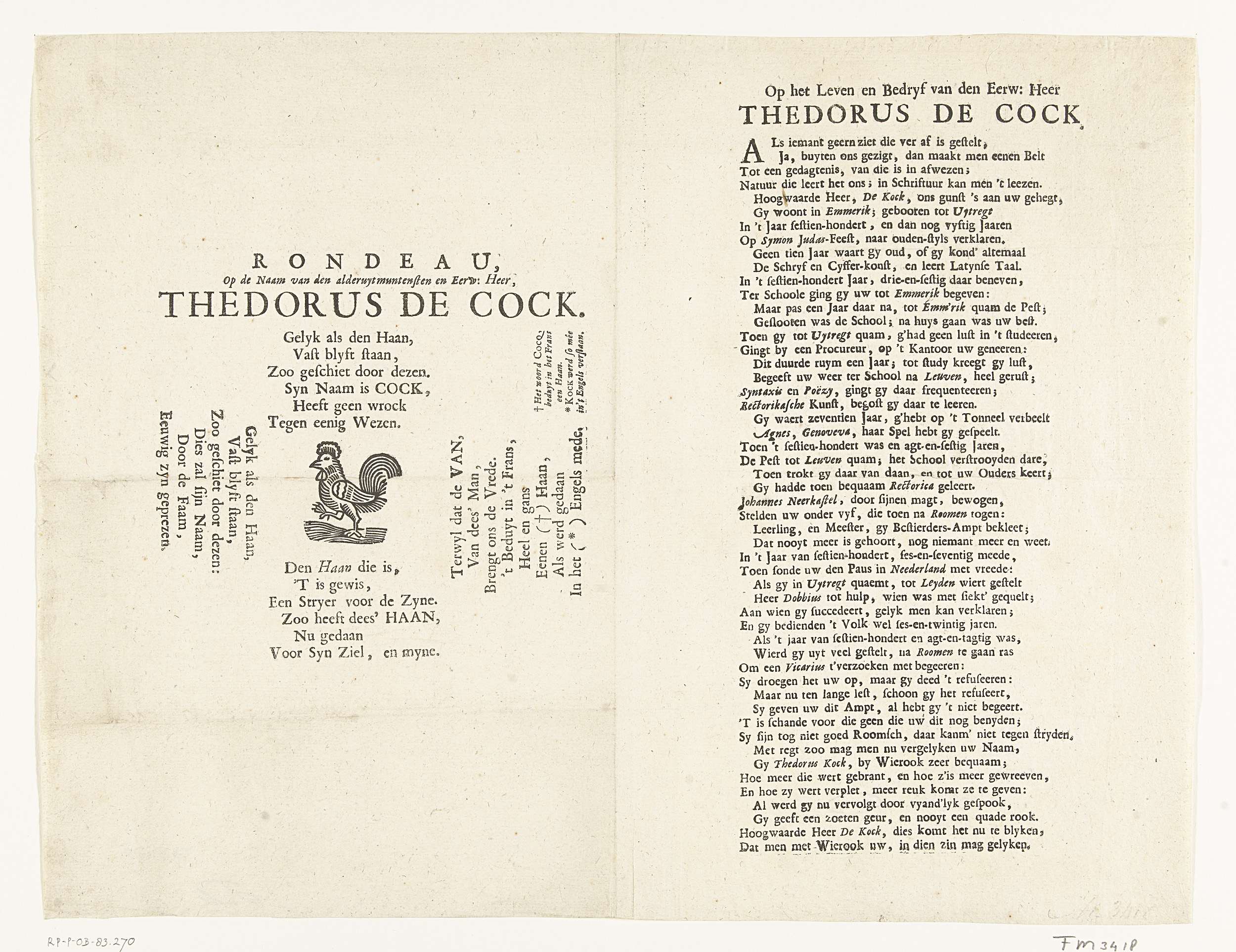 Spotprent op Theodorus de Cock, in de strijd tussen de jezuïeten en jansenisten in Nederland, ca. 1706. Om een haan vier zesregelige verzen, rechts een langer vers op het leven en bedrijf van Theodorus de Cock.