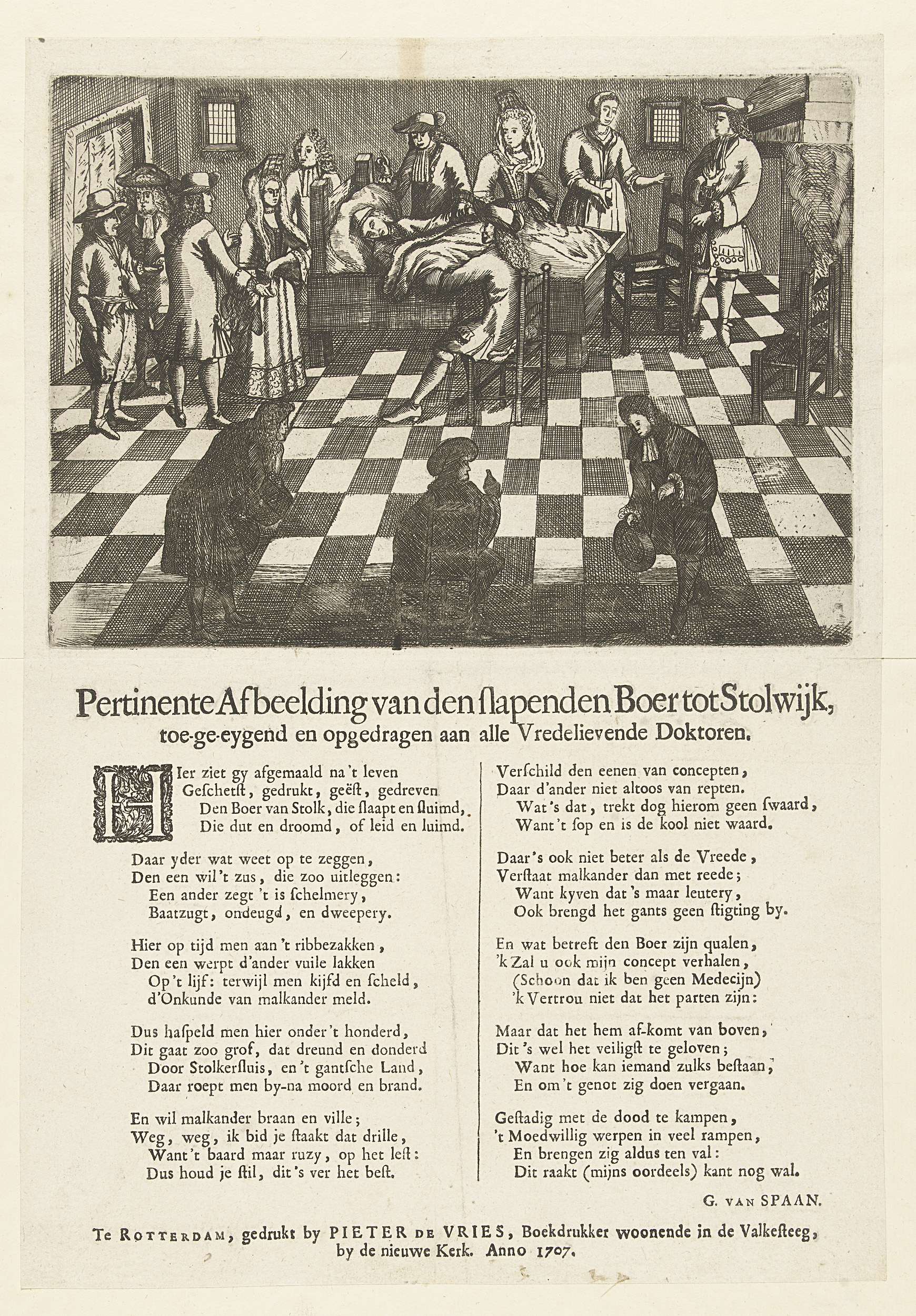 De slapende boer van Stolwijk, of de zgn. slapende Stolkse boer. Dirk Klaasz de Bakker sliep van 29 juni 1706 tot 11 januari 1707 (27 weken) en is na het wekken weer ingeslapen tot 15 maart 1707. De boer slapend in zijn bed, in de kamer enkele artsen en bezoekers. Gedrukt op het blad onder ...