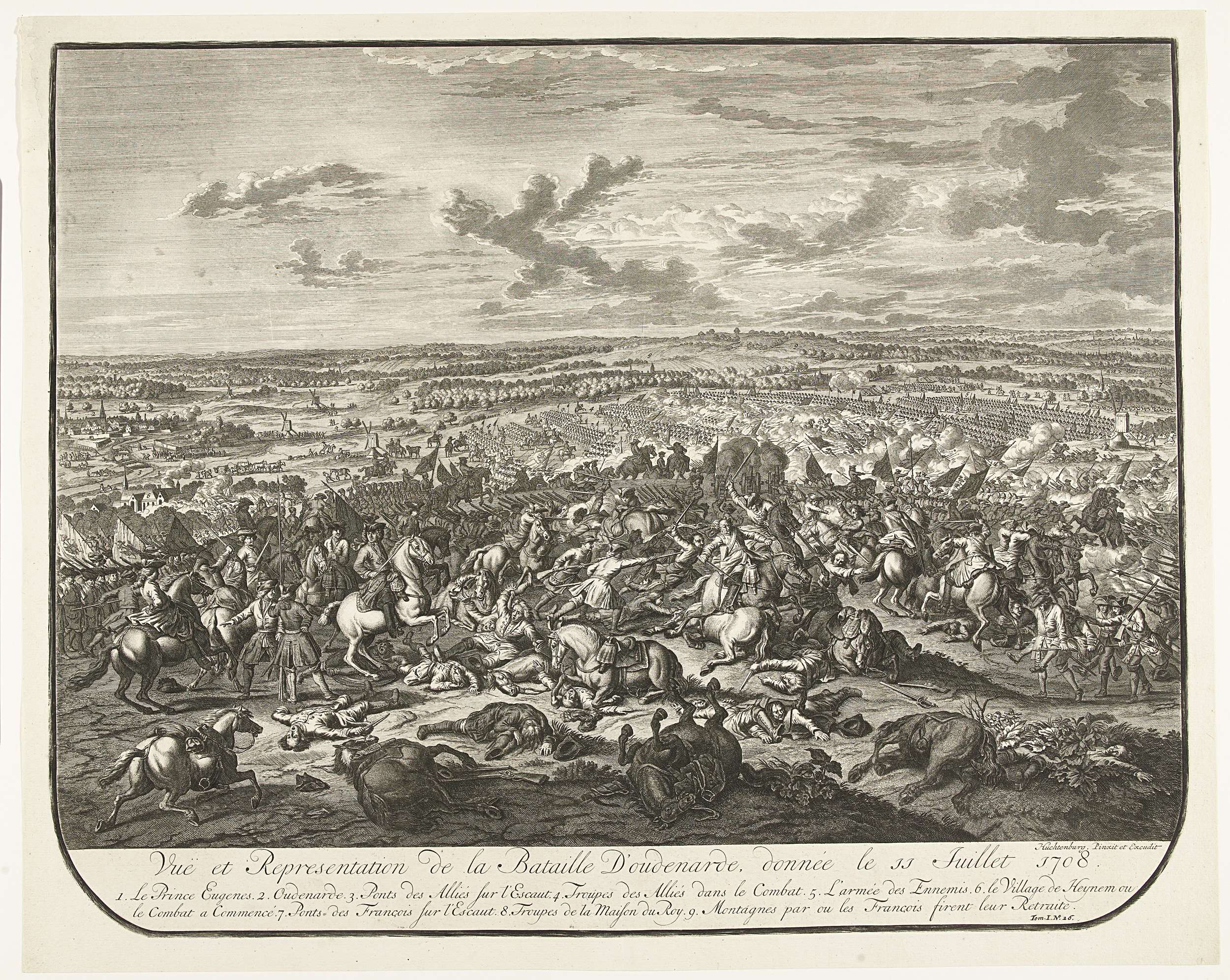 De slag bij Oudenaarde tussen de Geallieerden onder de prins van Savoye en de hertog van Marlborough en de Fransen, 11 juli 1708. Links de prins te paard. Genummerd rechtsonder: Tom. I. No. 26.