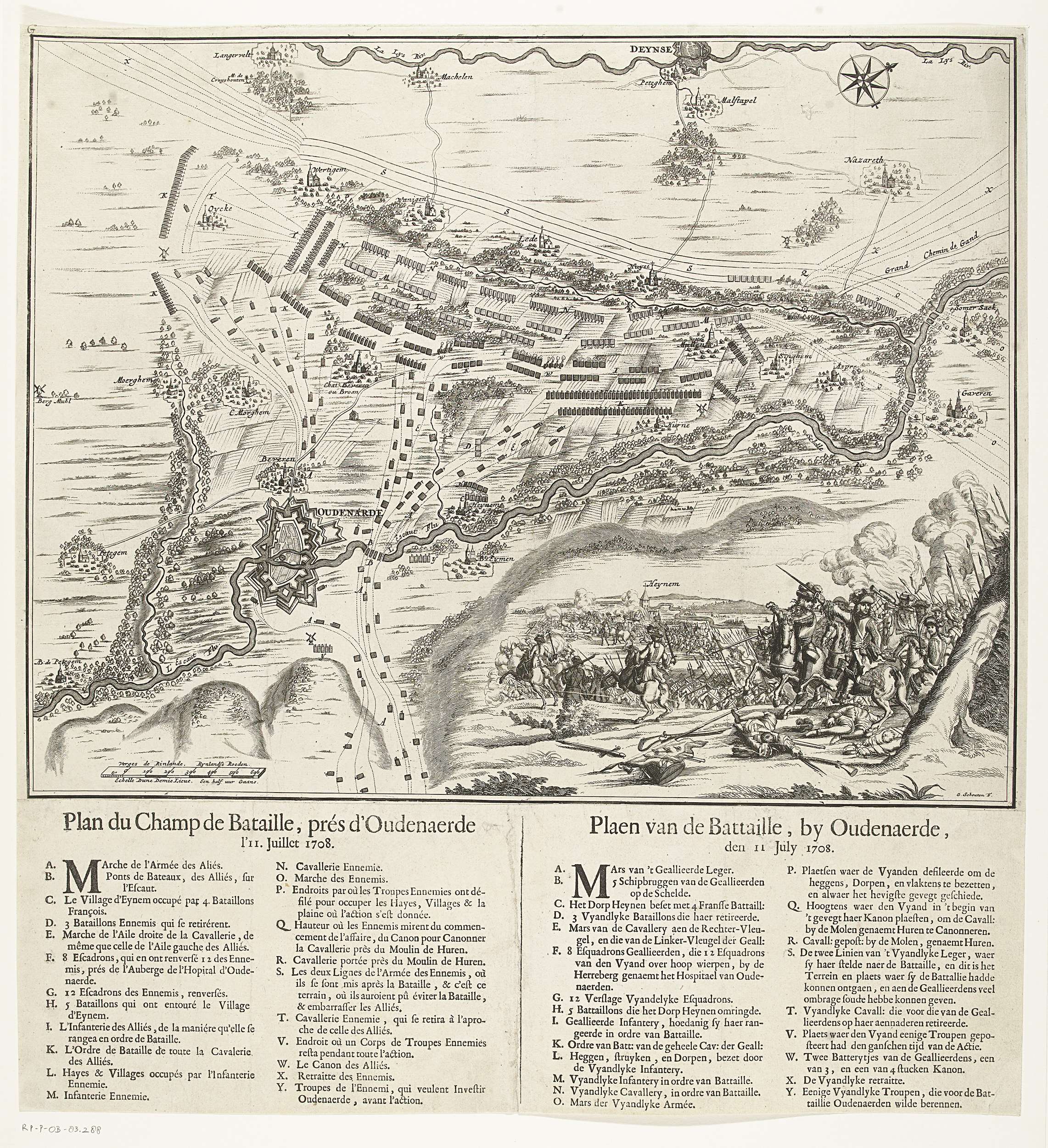 Plan van de veldslag bij Oudenaarde tussen de Geallieerden onder de prins van Savoye en de hertog van Marlborough en de Fransen, 11 juli 1708. Rechtsonder een scène waarin de legeraanvoerders hun troepen ten strijde voeren. Vastgeplakt onder de plaat een blad met de legenda's A-Y in het Frans en Nederlands.