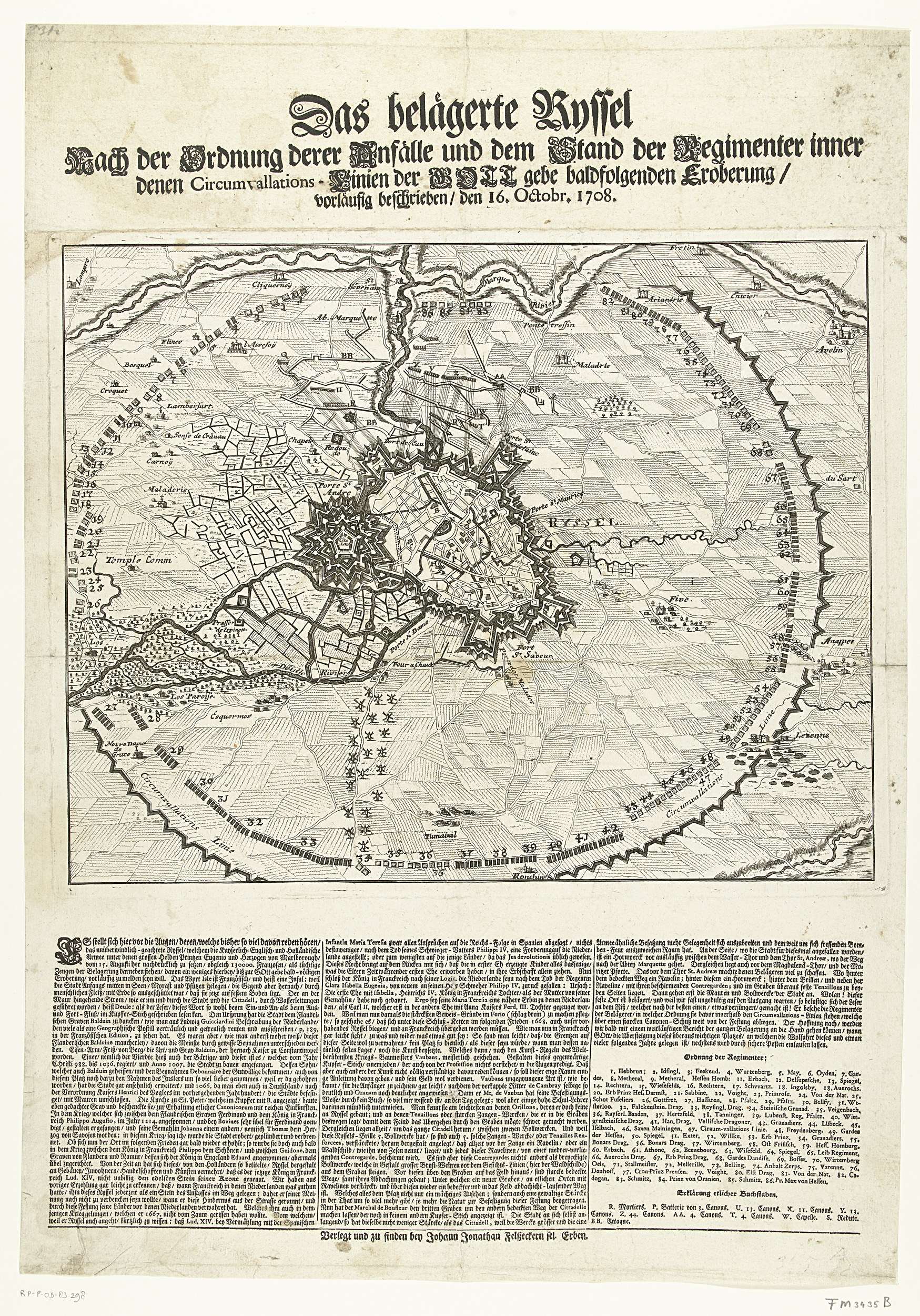 Plattegrond van het beleg vanaf 22 augustus 1708 van Rijssel (Lille) door de Geallieerden onder prins Eugenius van Savoye en prins Johan Willem Friso; afgebeeld is de situatie op 16 oktober. Gedrukt op het blad onder de plaat een tekst in 3 kolommen in het Duits.