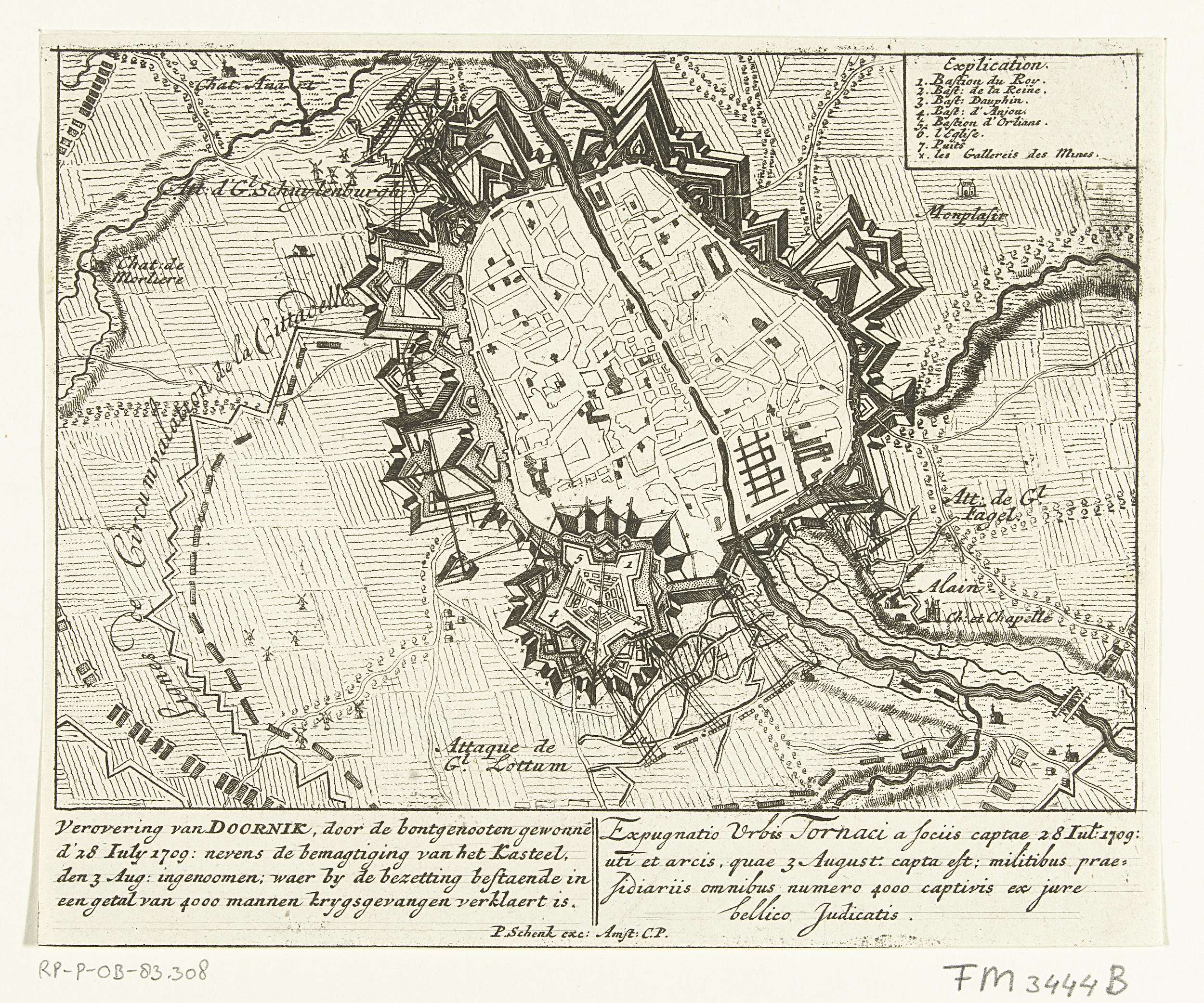 Plattegrond van Tournai (Doornik), belegerd door de Geallieerden vanaf 29 juni en ingenomen op 2 september 1709. Met onderschriften in het Nederlands en Latijn. Fragment van een grote plaat met negen voorstellingen van gebeurtenissen uit het jaar 1708 van de Spaanse Successieoorlog.