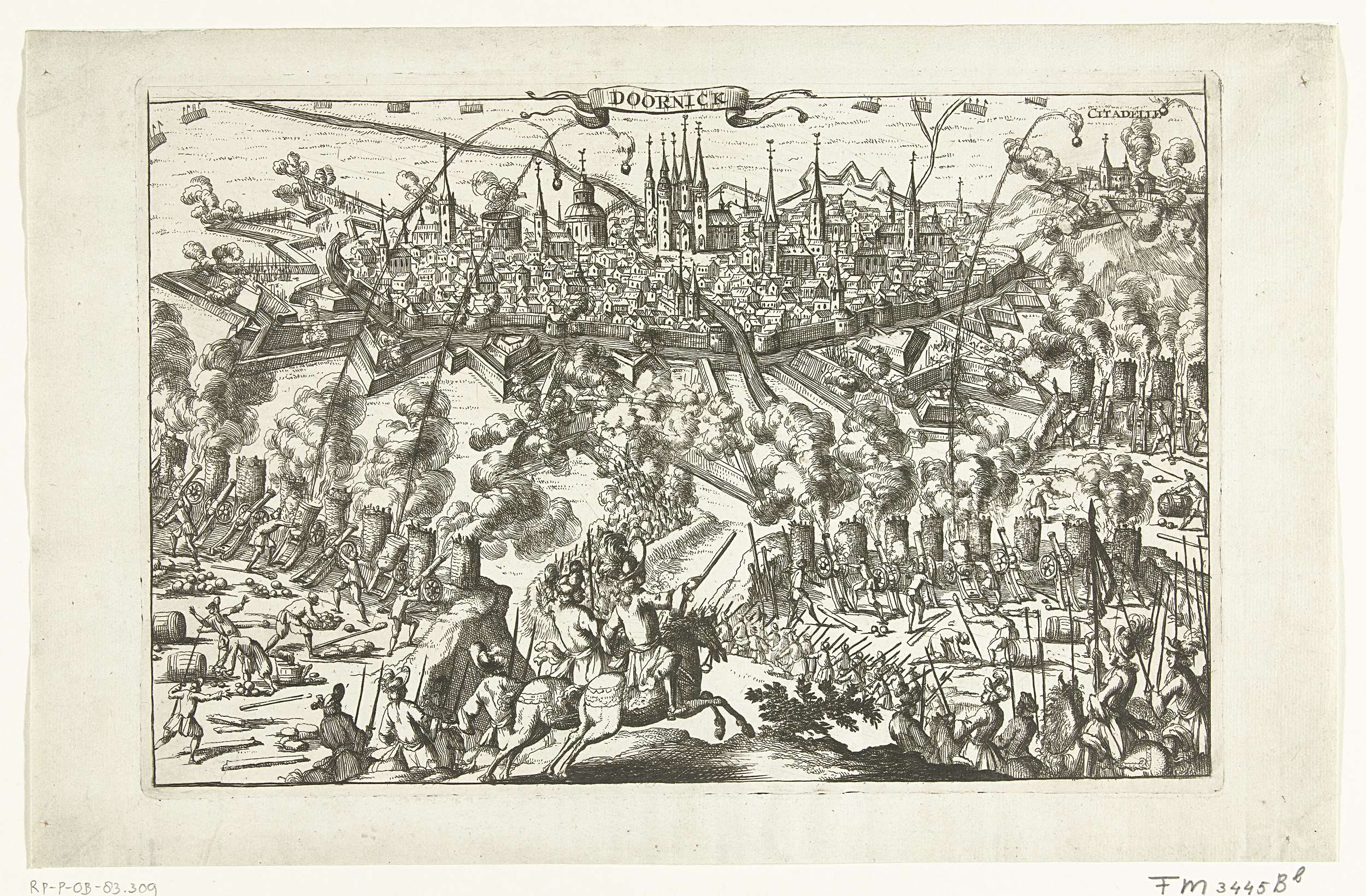 Tournai (Doornik) belegerd en beschoten door de Geallieerden vanaf 29 juni en ingenomen op 2 september 1709. Op de voorgrond de bevelhebbers te paard.