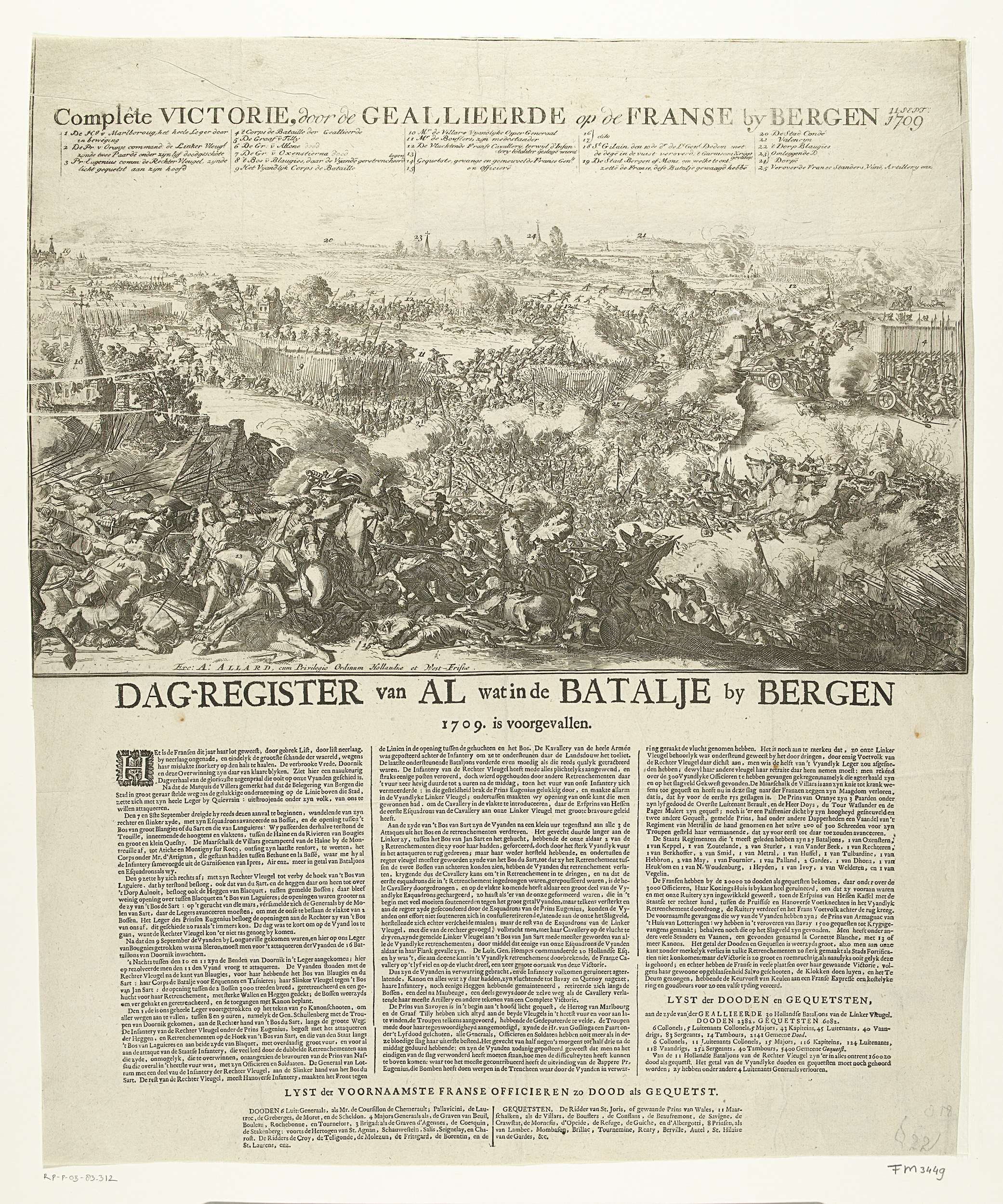 De slag bij Malplaquet tussen de Geallieerden onder de hertog van Marlborough en prins Eugenius van Savoye en de Fransen, 11 september 1709. Bovenaan de titel en de legenda 1-25. Gedrukt op het blad onder de plaat een dagregister van de slag in 3 kolommen gevolgd door een lijst van de voornaamste gedode en gewonde ...