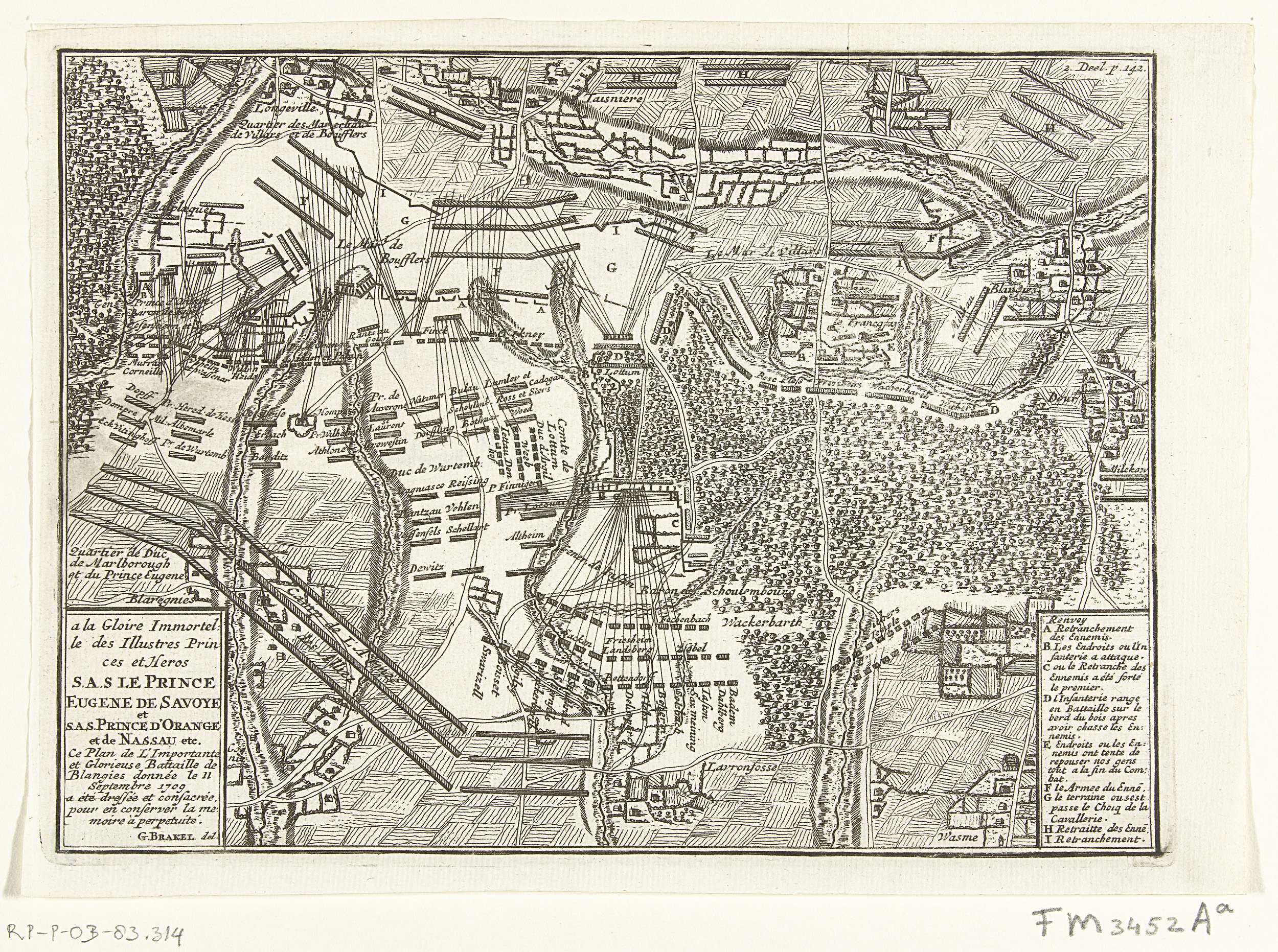 Kaart van de Slag bij Malplaquet waar de Fransen door de geallieerden werden verslagen, 11 september 1709. Illustratie in de Nederlandse vertaling uit 1716 van J. Lamigue, Het leven van Zyne Hoogheit Johan Willem Friso, dl. II, p. 142/143.