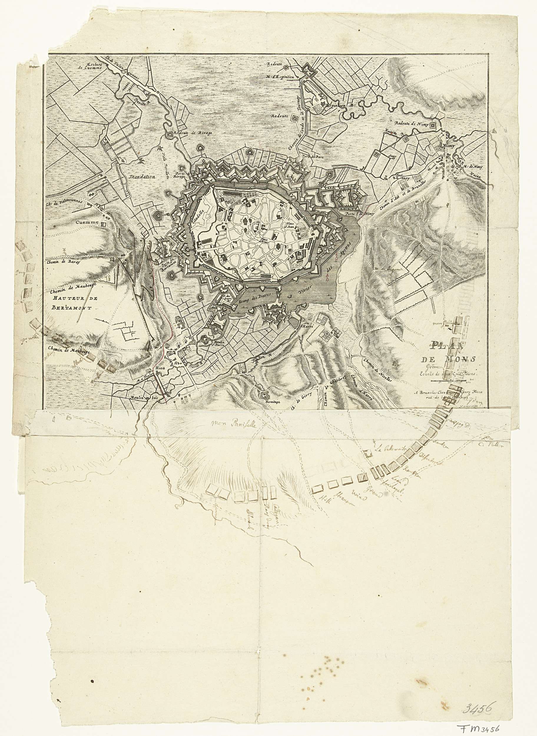 Kaart van Mons (Bergen) waarop de ligging van de belegerende Geallieerde troepen in bijgetekend, september-oktober 1709. Aan de onderzijde van de prent is een blad geplakt met een getekende aanvulling op de kaart.