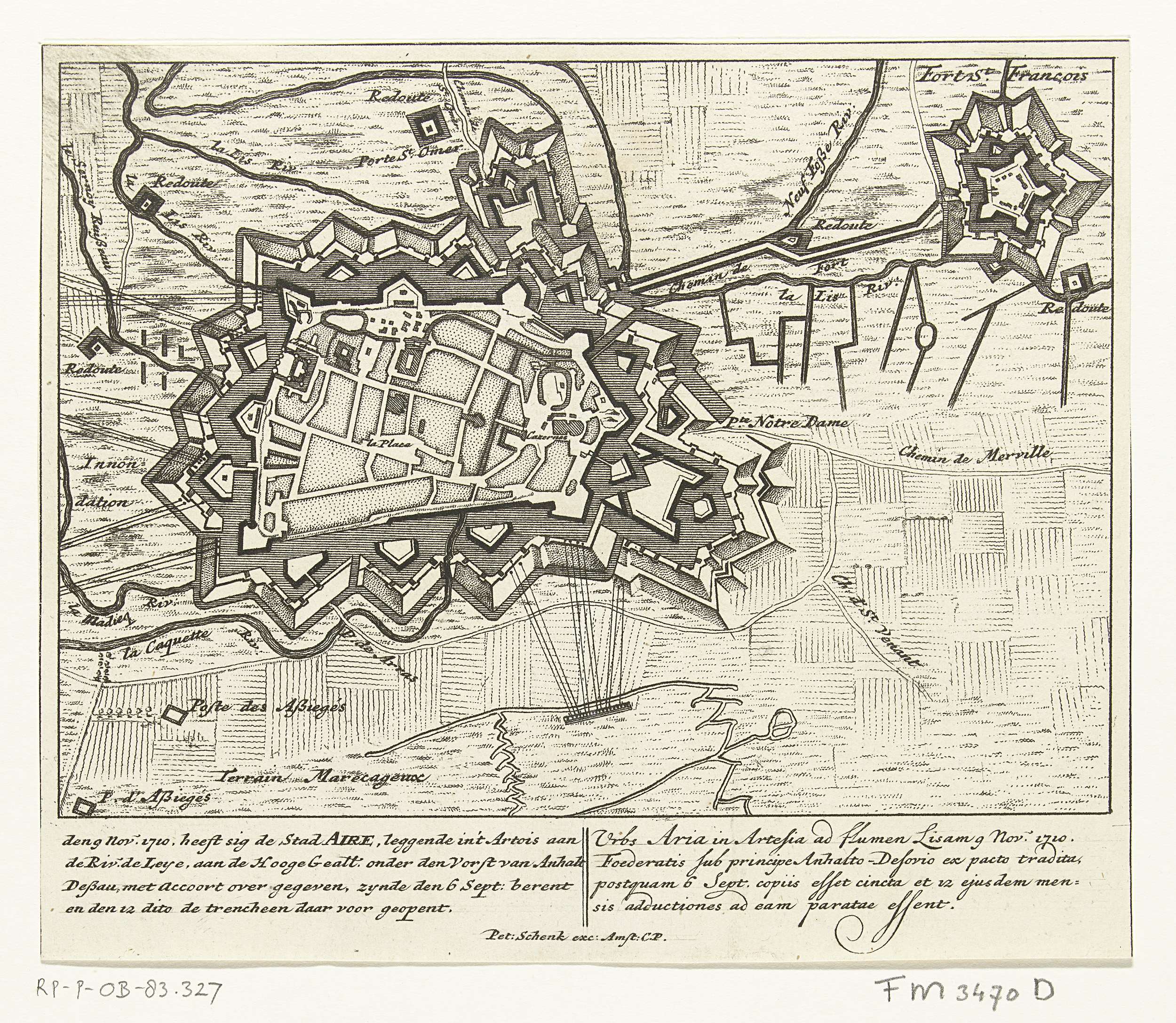 Plattegrond van Aire, belegerd en ingenomen door de Geallieerden, 8 november 1710. Met onderschriften in het Nederlands en Latijn. Fragment van een grote plaat met negen voorstellingen van gebeurtenissen uit het jaar 1710 van de Spaanse Successieoorlog.