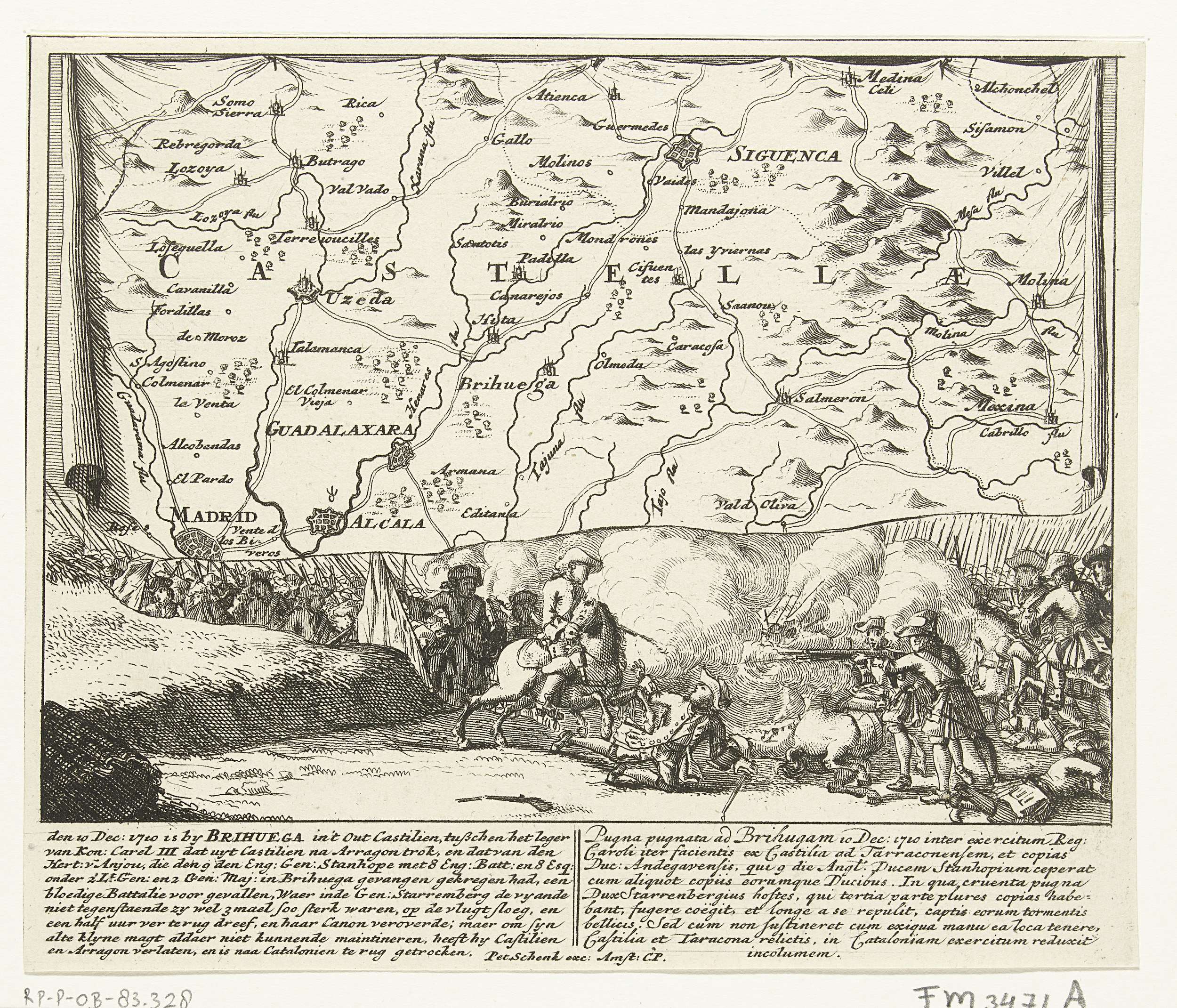 Kaart en voorstelling van de slag bij Brihuega in Castilië waar de Fransen door de Geallieerden werden verslagen, 10 december 1710. Met onderschriften in het Nederlands en Latijn. Fragment van een grote plaat met negen voorstellingen van gebeurtenissen uit het jaar 1710 van de Spaanse Successieoorlog.