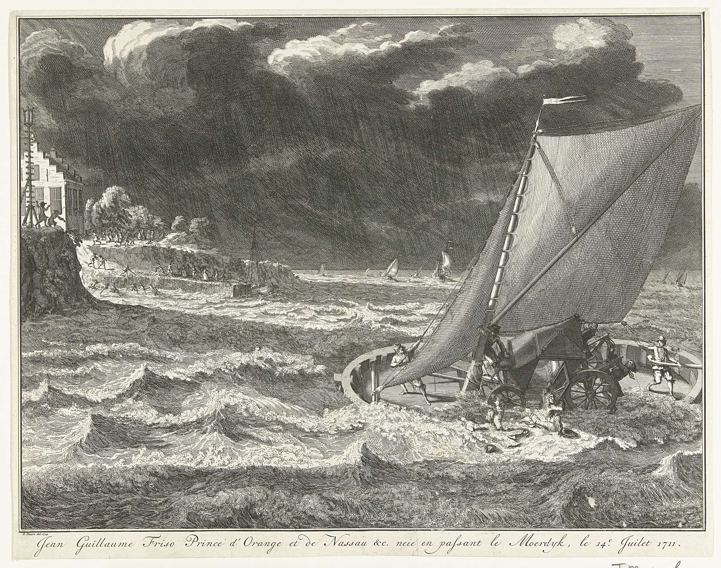 Johan Willem Friso, prins van Oranje-Nassau, verdrinkt tijdens het oversteken van de Moerdijk tijdens zwaar weer op 14 juli 1711. De boot waarop de koets van de prins staat kapseist en meerdere personen raken te water.