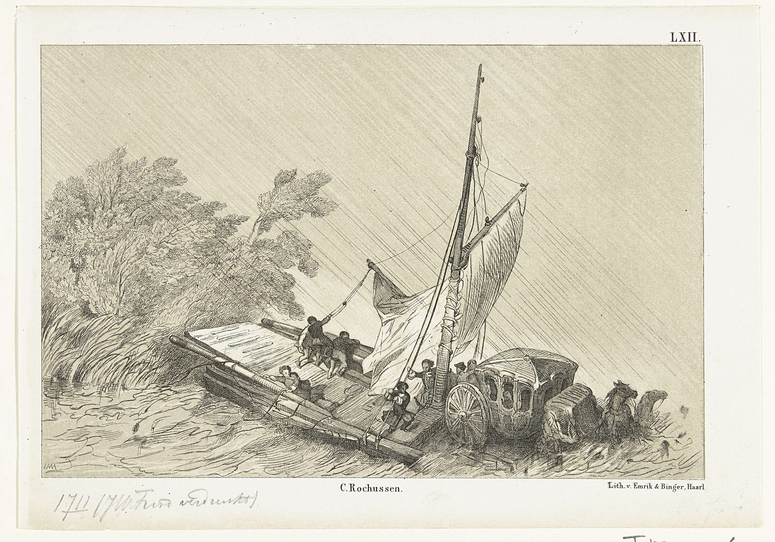 Johan Willem Friso, prins van Oranje-Nassau, verdrinkt tijdens het oversteken van de Moerdijk tijdens zwaar weer op 14 juli 1711. De boots waarop de koets van de prins staat kapseist en meerdere personen en paarden raken te water. Gemerkt rechtsboven: Pl. LXII.