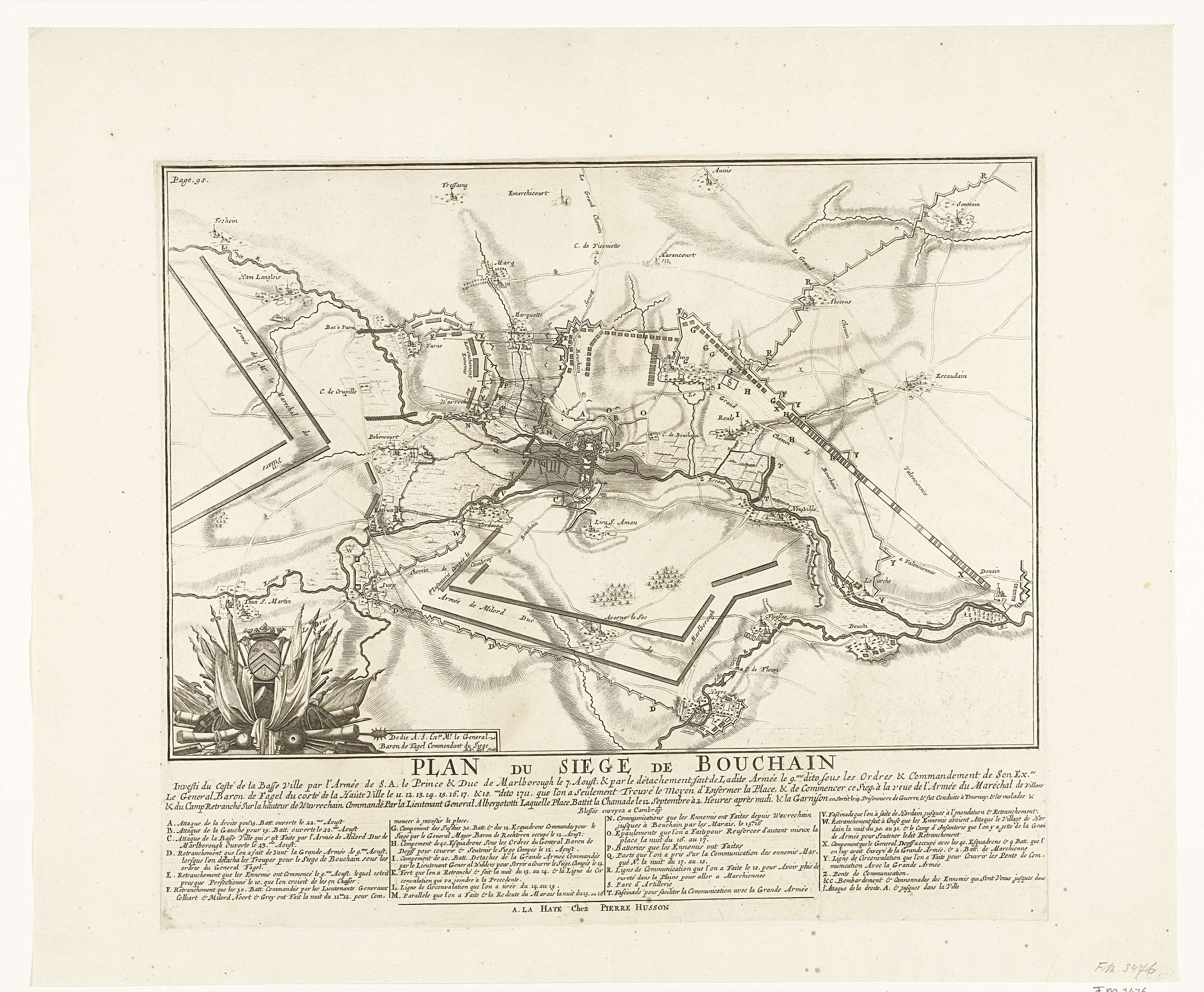 Kaart van de De Noord-Franse stad Bouchain, belegerd vanaf 7 augustus en ingenomen door de Geallieerden onder de hertog van Marlborough op 12 september 1711. Gemerkt linksboven: Page 98.